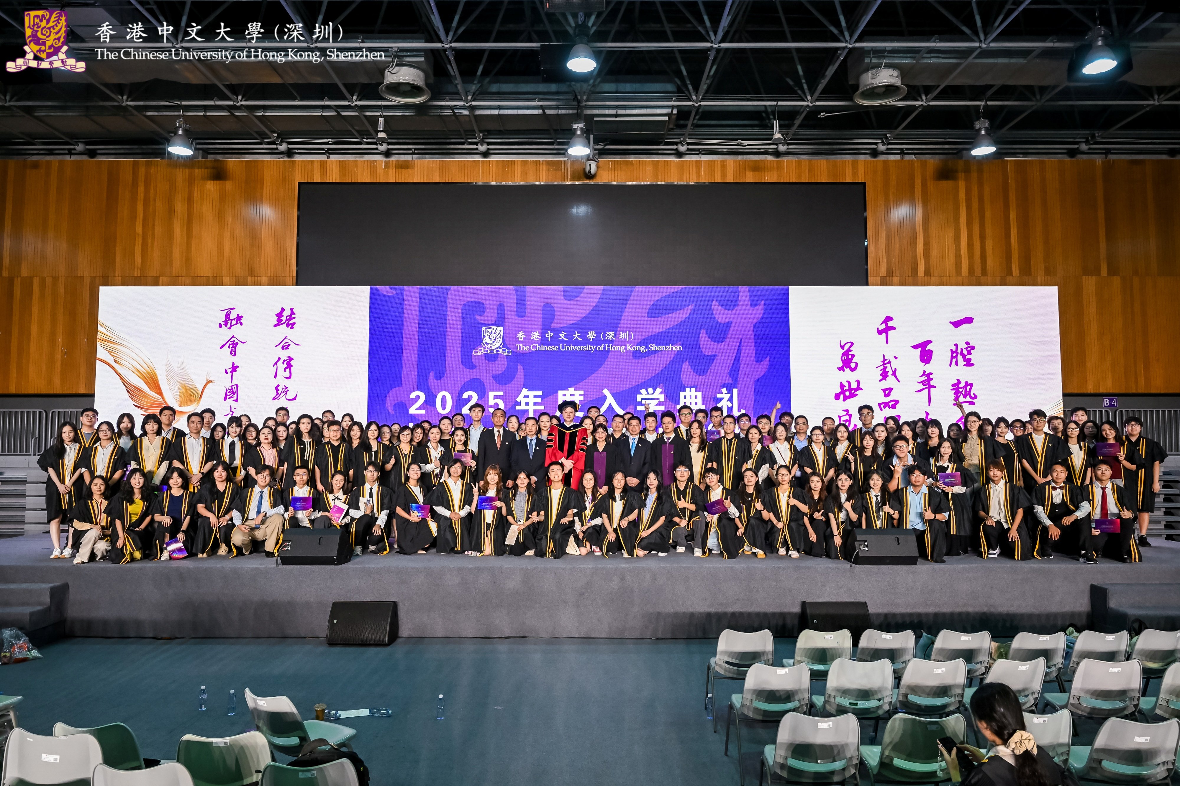 August 30, 2025?– The Chinese University of Hong Kong, Shenzhen (CUHK-Shenzhen) held its?Inauguration Ceremony for Students 2025, welcoming over 4,600 undergraduate and postgraduate students from around the world to embark on a new journey. President Xu Yangsheng and University Leadership, alongside representatives from the University Governing Board and faculty, joined undergraduate and doctoral freshmen in the main venue at Liwen Hall for the ceremony. Master's students participated simultaneously via livestream in the University Sports Hall. Parents of new students and guests from various sectors witnessed the students embarking on this new life chapter online.