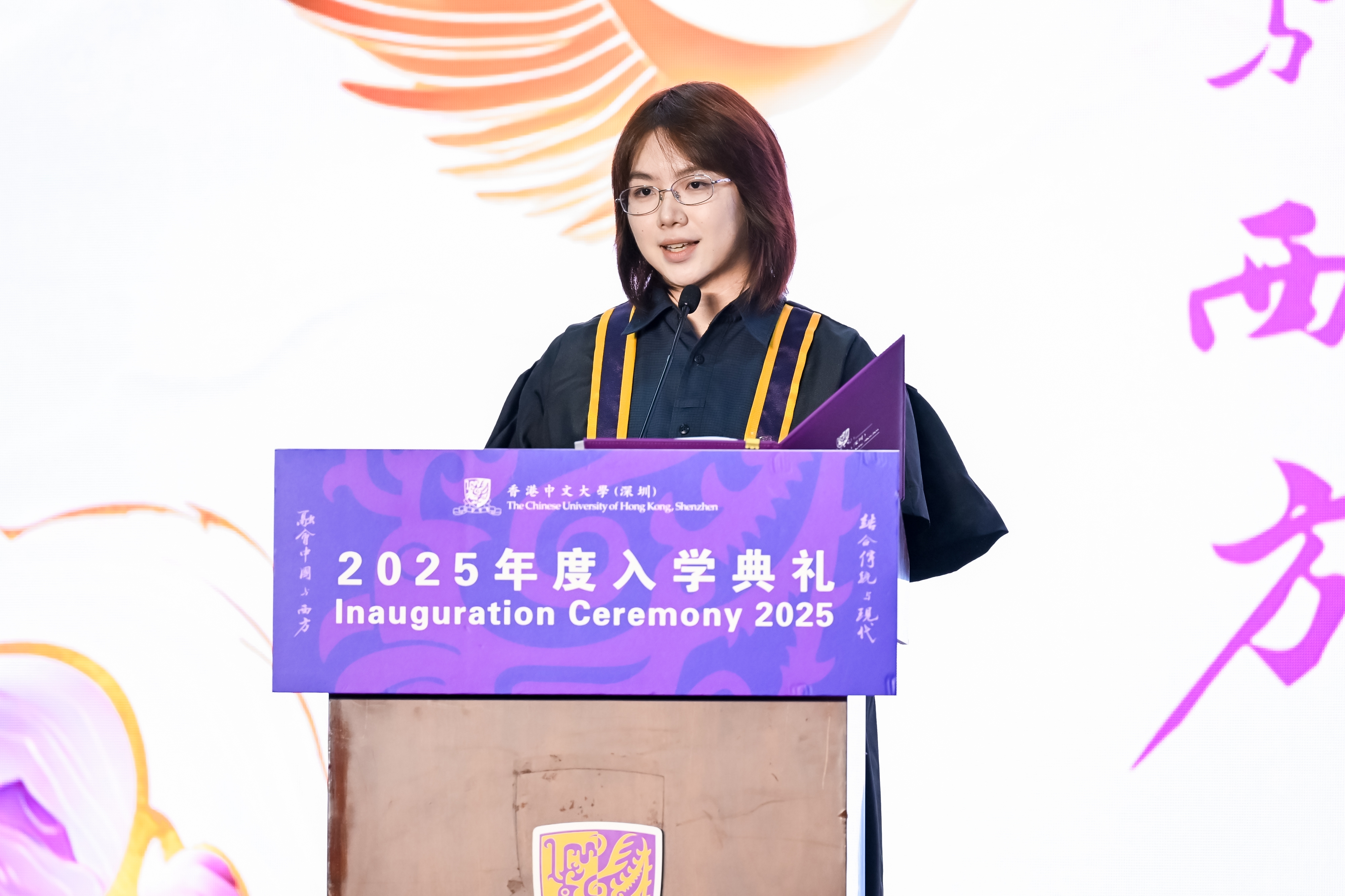 She encouraged all freshmen to make full use of the University's diverse, open, and vibrant platform, to delve into academics while also experiencing life and daring to explore, to discover passions and pursuits. Finally, she wished her fellow students to be as passionate and persevering as the Bauhinia flower, rooted in the University motto, setting sail from CUHK-Shenzhen towards a broader world and a more expansive future.
