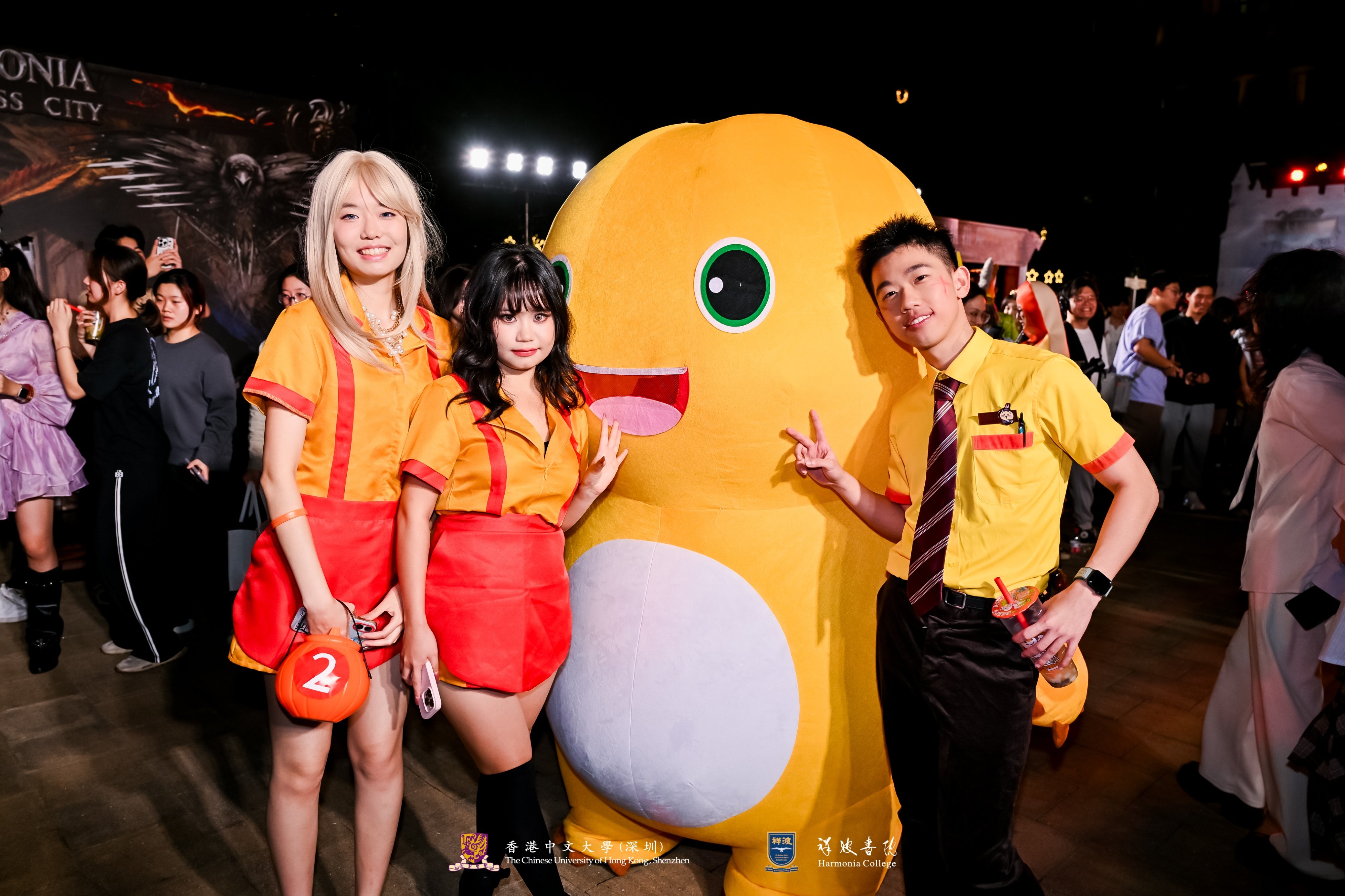 Booths like Cake Lab, Glowing Twistery, and Mask Studio, drew large crowds of students and faculty. From making desserts to crafting pumpkin lanterns and painting masks, the night was filled with laughter and excitement. The CUHKSZ Electronic Music Club, Harmonia College Hurricane Dance Team, and Hip-Hop Music Club took turns on stage, igniting the atmosphere with beats, dance, and rap performances.