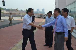 Prof. Xu introducing the development and construction of the school to the guests and showing guests the sites around the campus.