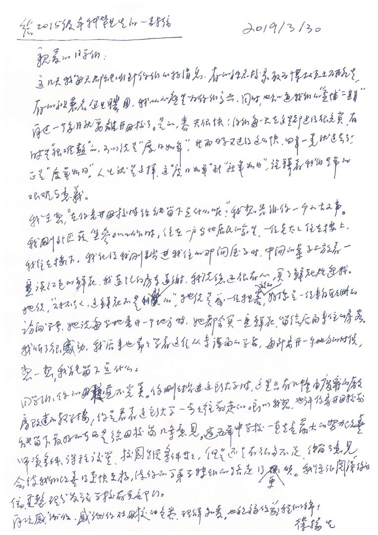 Among the most wonderful things you can leave to your Alma Mater, I think, will be one or two ideas for the university from your unique perspective. Our university, as you can see, is far from perfect. Step by step, you have witnessed its development from a cluster of renovated industrial buildings into what we have now. In the past five years, we have spared no effort in advancing our faculty level, curriculum design, and campus facilities, despite which, there still remains a lot to be done. Your suggestions shall accelerate our improvement and pave a smoother way for your upcoming schoolmates. Each of your letters, I assure, will have my close attention, and shall be duly dispatched to each concerned unit of our university.