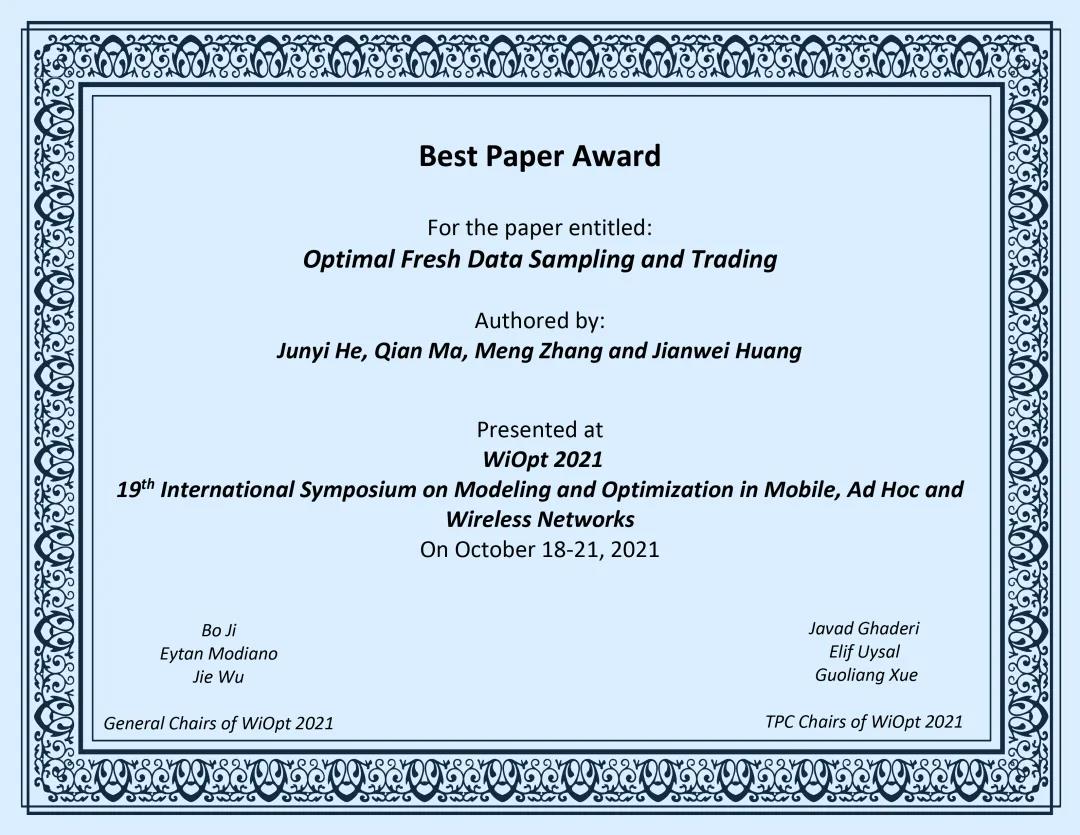 IEEE WiOpt 2021 Best Paper Award for Jianwei Huang and His Team