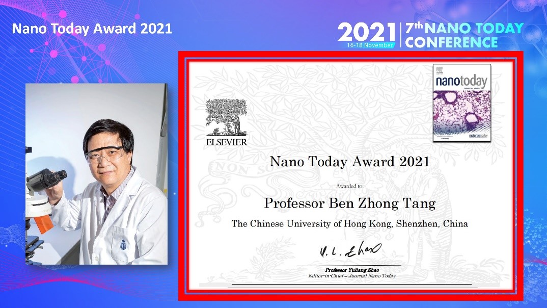Prof. Benzhong Tang, Dean of the School of Science and Engineering, CUHK-Shenzhen was awarded the Nano Today Award 2021 at the 7th Nano Today Conference taking place on November 16, 2021. The award is in recognition of his pioneering research on nanostructured materials. Dean Tang is the first scientist in the Chinese academic sector to receive the Award since its establishment.