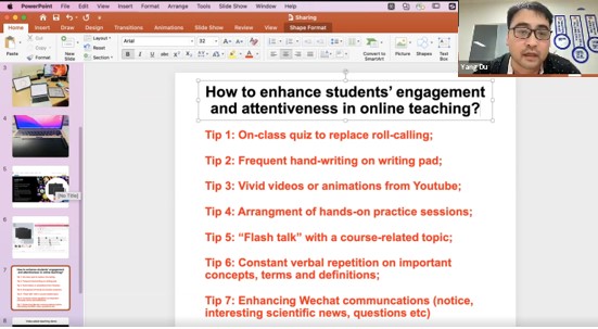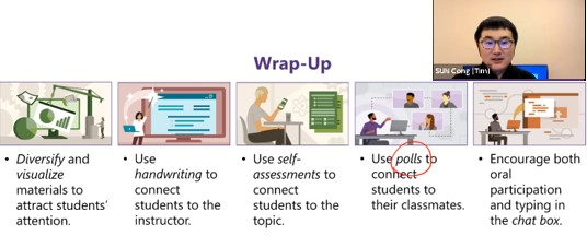 Dr. SUN Cong adopted the on-camera delivery to share videos so as to decrease the intension of the internet bandwidth. He used Poll to ask students questions based on the content of the video. Dr. SUN summarized five tips for us. To attract students’ attention and improve their engagement in online lecture, teacher can: find more diversified and visualized materials; use handwriting, self-assessments and Polls to keep students’ attention and interaction; and encourage them voice out their opinions or type in the Chatbox, etc.