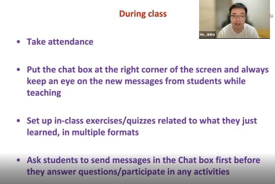 The third speaker was Prof. HE Jinbo. His strategies to keep students engaged in online teaching are: 1. Randomly check student attendance; 2. Keep an eye on the Chatbox on the screen and give responses to students’ messages frequently; 3. Design in-class assessments in different formats; 4. Ask students to type in messages in the Chatbox before answering questions.