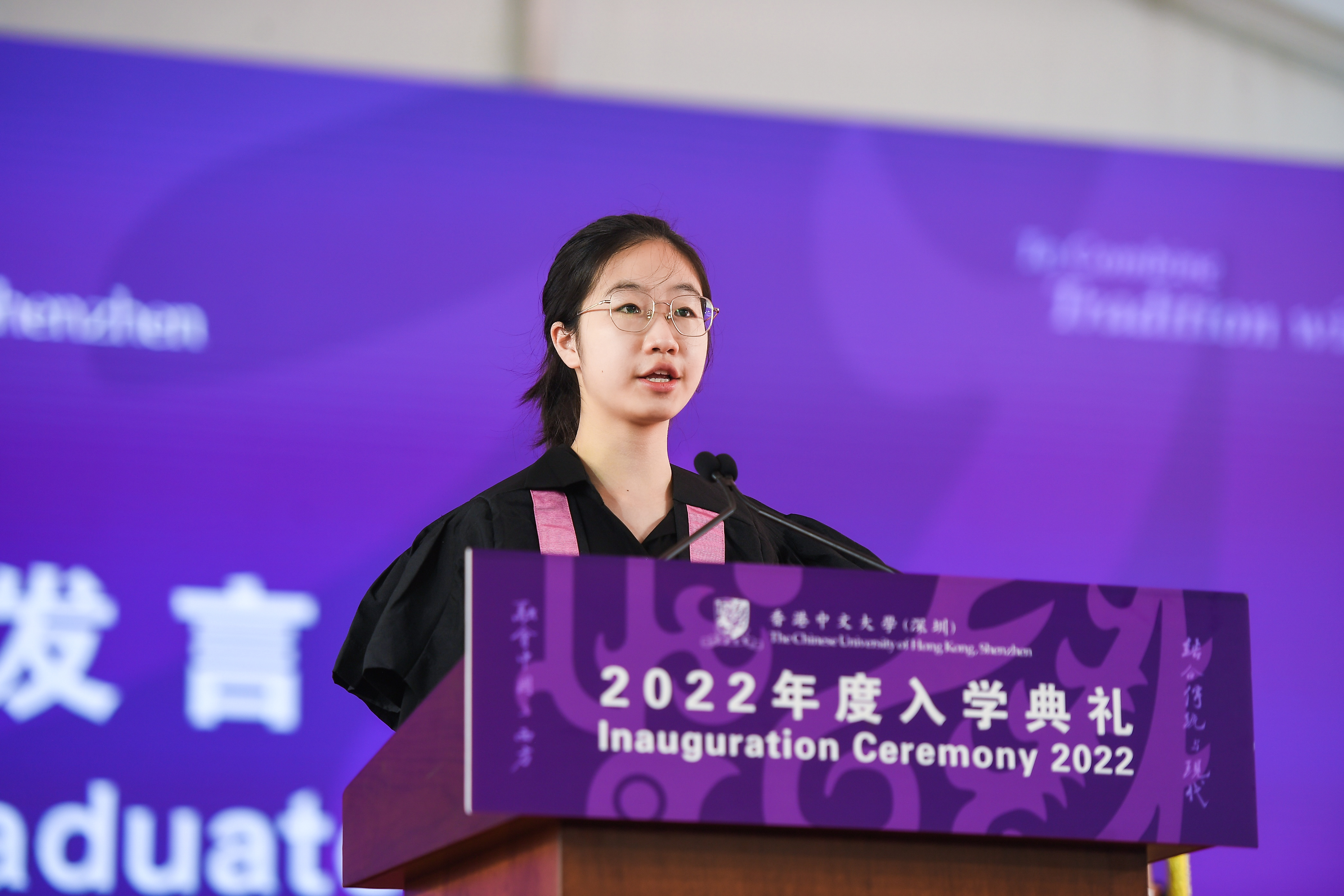 Yining Mao, the undergraduate representative from the School of Data Science and Muse College, shared her three magical encounters with CUHK-Shenzhen during her speech. She said, "University is such an important period of our life, in which our concepts towards life, dream and the world are mostly shaped. Therefore, it is of great importance to be given more opportunities to see things from various angles. Obviously, CUHK-Shenzhen will give us these chances."