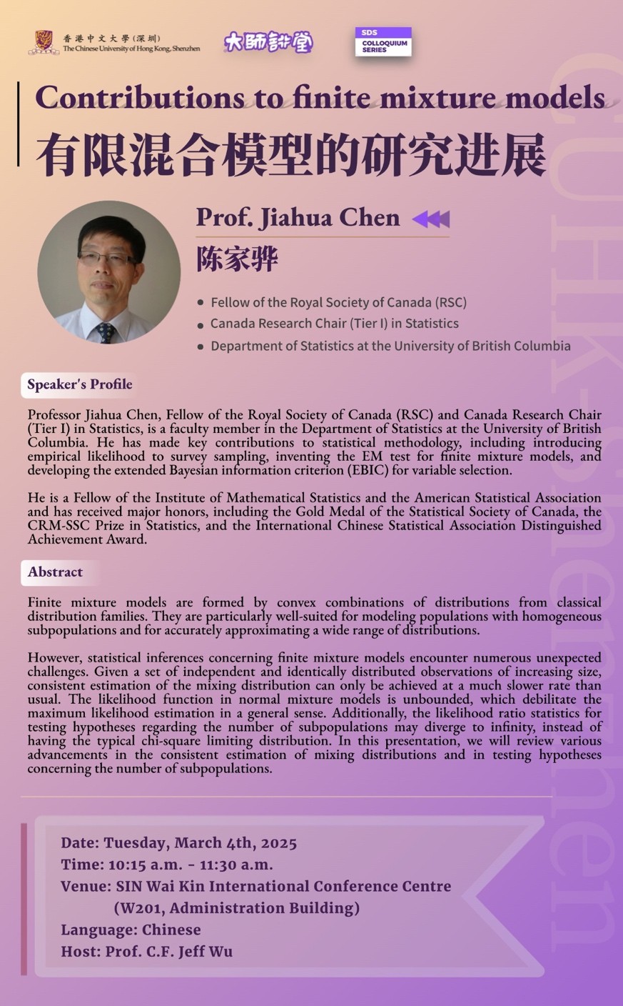 Professor Jiahua Chen, Fellow of the Royal Society of Canada (RSC) and Canada Research Chair (Tier I) in Statistics, is a faculty member in the Department of Statistics at the University of British Columbia. He has made key contributions to statistical methodology, including introducing empirical likelihood to survey sampling, inventing the EM test for finite mixture models, and developing the extended Bayesian information criterion (EBIC) for variable selection.