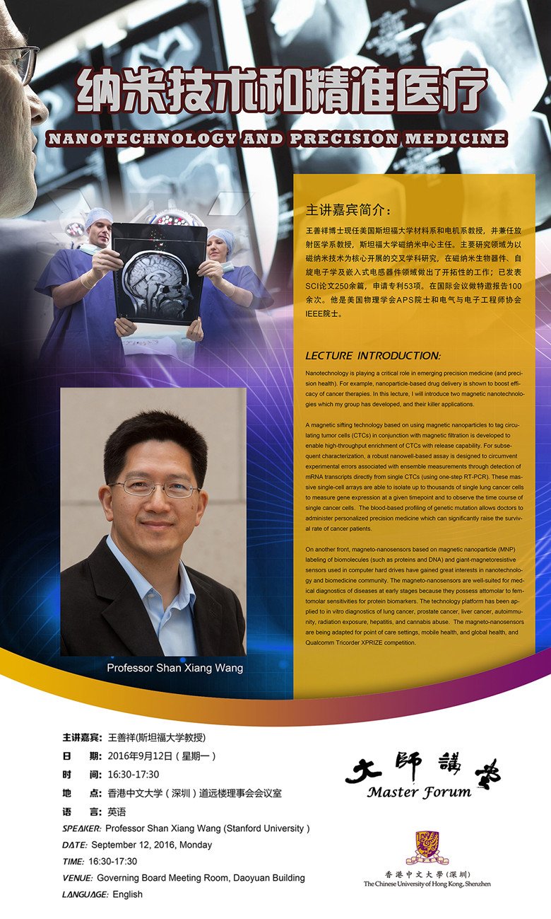 Dr. Wang is a Professor of Materials Science & Engineering and jointly Professor of Electrical Engineering at Stanford University, and by courtesy, a Professor of Radiology at Stanford School of Medicine. He directs the Center for Magnetic Nanotechnology, and is a co-Principal Investigator of the Center for Cancer Nanotechnology Excellence for Translational Diagnostics (CCNE-TD) at Stanford University. He has over 250 publications, and holds 53 issued or pending patents in the area of magnetic nanotechnology, biosensors, nanofabrication, spintronics, power management and information storage. He is a scientific founder of MagArray Inc. and serves on the advisory boards of Nvigen Inc. and several other companies. He is a Fellow of the Institute of Electrical and Electronics Engineers (IEEE) and a Fellow of American Physical Society (APS) for his seminal contributions to magnetic materials and nanosensors. He has been recognized by numerous other honors and awards, including an Inaugural Frederick Terman Fellowship, and a Distinguished Award in Nokia Sensing XCHALLENGE.