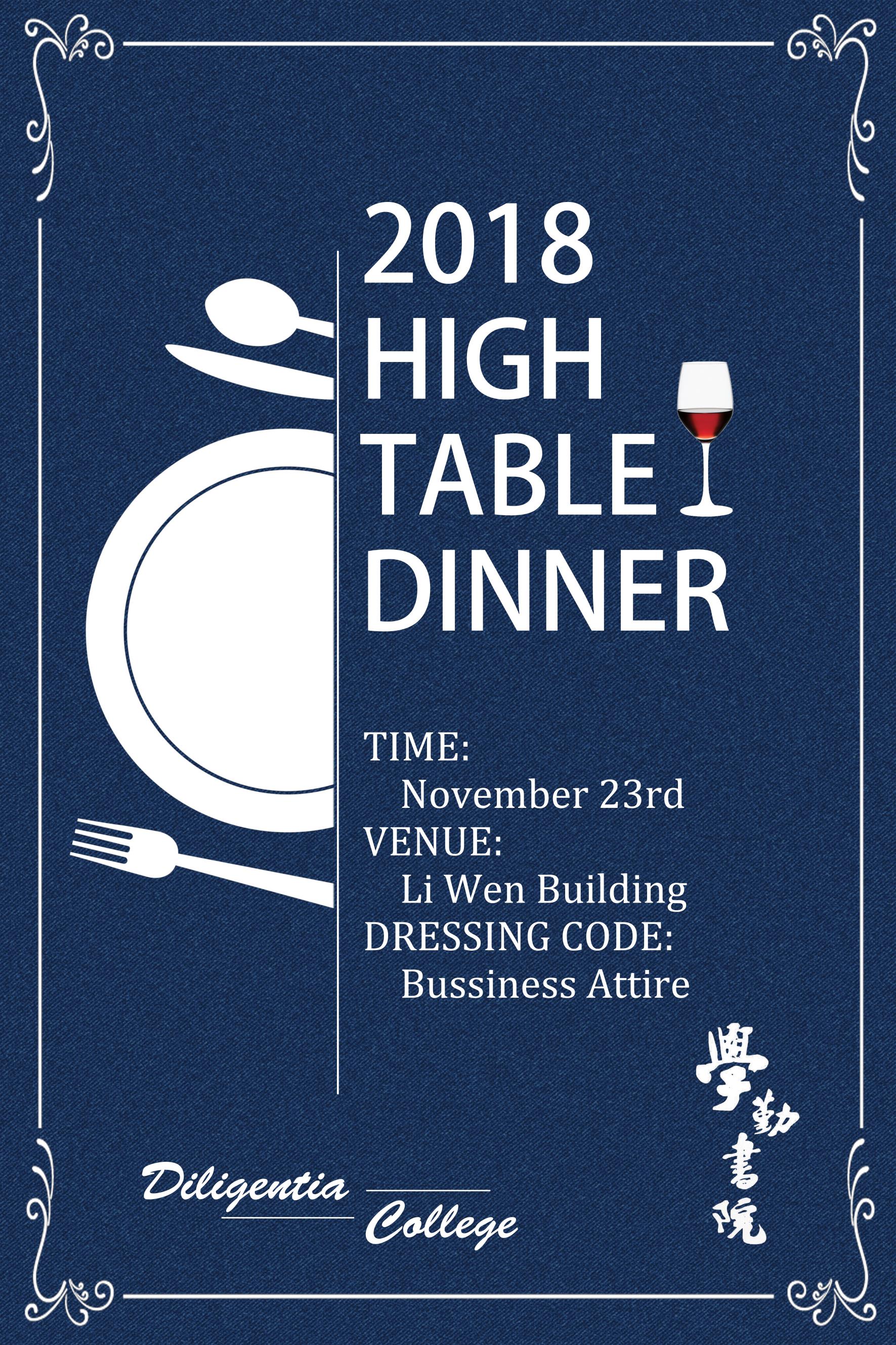 2018 High Table Dinner of Diligentia College is scheduled at 6:00 pm on Friday, 23rd November, at Li Wen Building of the University. We will provide pick-up service at the Administration Building (West Wing) at 5:50 pm. As our distinguished guests, please feel free to let us know if you have any special dietary requirements.