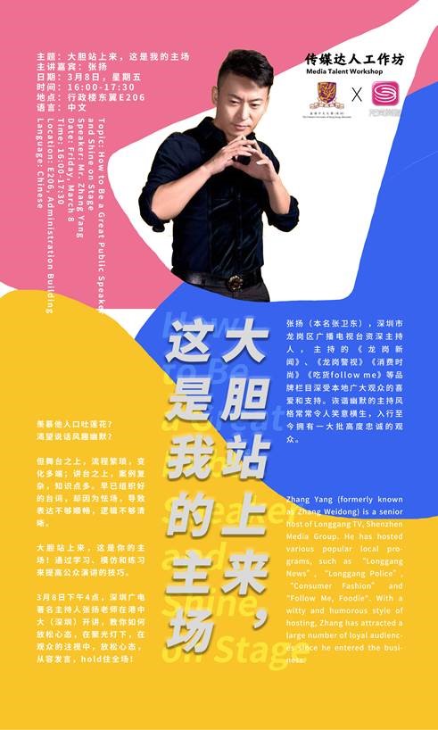 ? ? ? ? At 4 p.m. on the coming March 8th, Zhang Yang, a celebrated host of Shenzhen Media Group, will be at CUHK-Shenzhen to give a lecture on how to relax your mind and speak smoothly under the spotlight.