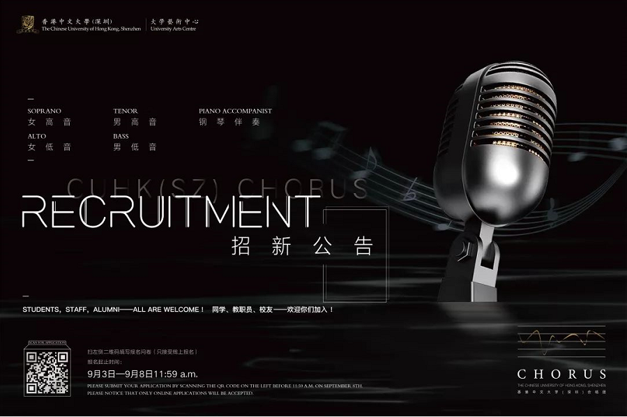 The Chorus of the Chinese University of Hong Kong, Shenzhen was formerly?the?Student Chorus (established in October 2014) and the Staff Chorus (established in August 2015). Since its foundation, adhering to the concept of innovation and diversification, the Student Chorus has been successful in performing a wide range of classical and popular songs in both Chinese and foreign languages, including "The Seal Lullaby", "Baba Yetu", "Just One Time", "The Joy of Snowflakes", and "Time to?Say Goodbye". It has also performed in important?events on and off campus, including the Annual Concert of the Chinese University of Hong Kong, Shenzhen from 2015 to 2018, the 2017 CUHK(SZ) Student Chorus Concert, and Longgang Water Music Festival from 2018 to 2019. Five years since establishment, it has become an influential chorus that masters various music styles.?For the Staff Chorus, apart from?joining the Student Chorus in some of the above-mentioned performances, it has also given performances on its own at each year 's Welcoming Party.