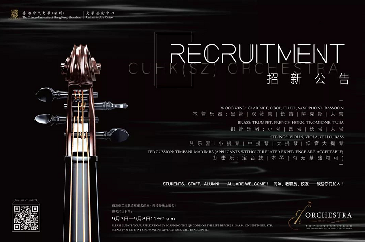 The Orchestra of the?Chinese University of Hong Kong, Shenzhen was established in 2015, composing?of?undergraduates who were from different schools and majors, who?got together because of their passion for classical music. Currently, CUHK(SZ) Orchestra targets at not only students, but also staff, even alumni for recruitment. The Orchestra has been dedicated to the development of classical music on campus, and the promotion of both classical?and modern music. It participated in the Annual Concert of the Chinese University of Hong Kong, Shenzhen from 2015 to 2017 and the 2017 CUHK(SZ) Student Chorus concert, collaborating with the Student Chorus to perform excellent music pieces such as Let it Go, Baba Yetu, and I?Like it. The Orchestra is planning to perform more pure orchestral music?and invite well-known conductors?for exchange of ideas in the future.
