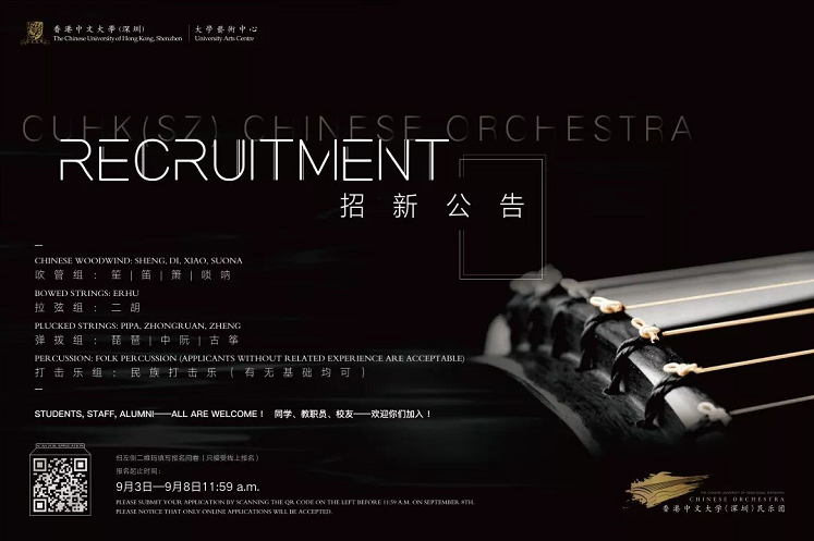 The Chinese Orchestra of the Chinese University of Hong Kong, Shenzhen was established in August 2018. Its members play a number of musical instruments such as Zheng, Pipa, Bamboo Flute, and ethnic percussions. In practice, the Chinese Orchestra aims?to demonstrate and explore the charm of folk music, as well as popularize specialized knowledge. Meanwhile, it will rehearse and perform outstanding folk music pieces to help those interested in folk music improve their skills and broaden their horizon, making the culture of folk music come to fruition on campus.?