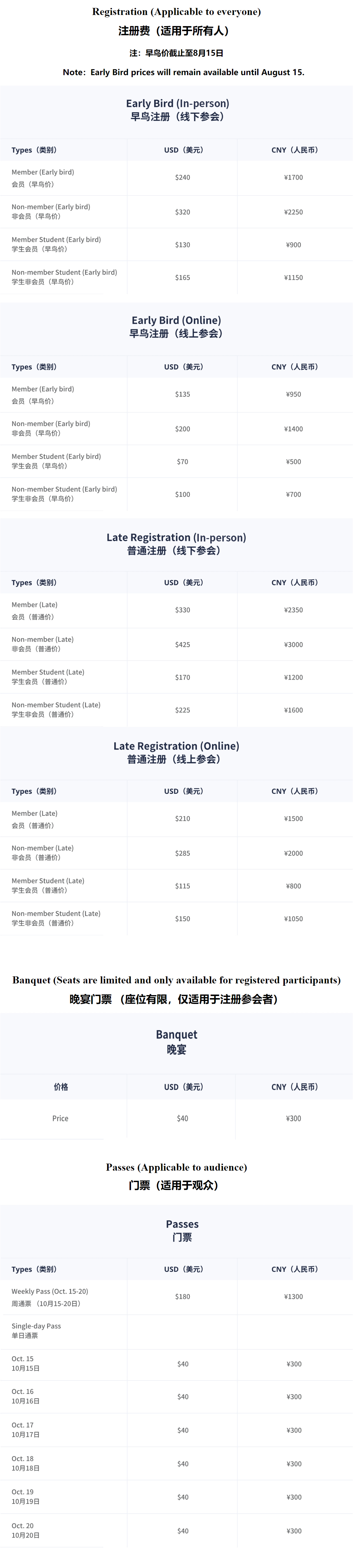 For the details about conference registration fees and passes prices, please refer to the chart below.