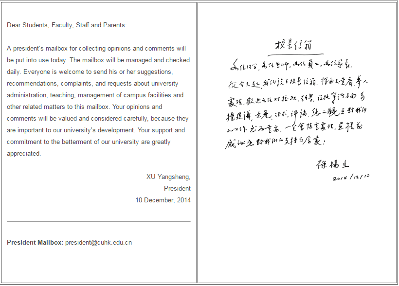 Mail To: president@cuhk.edu.cn