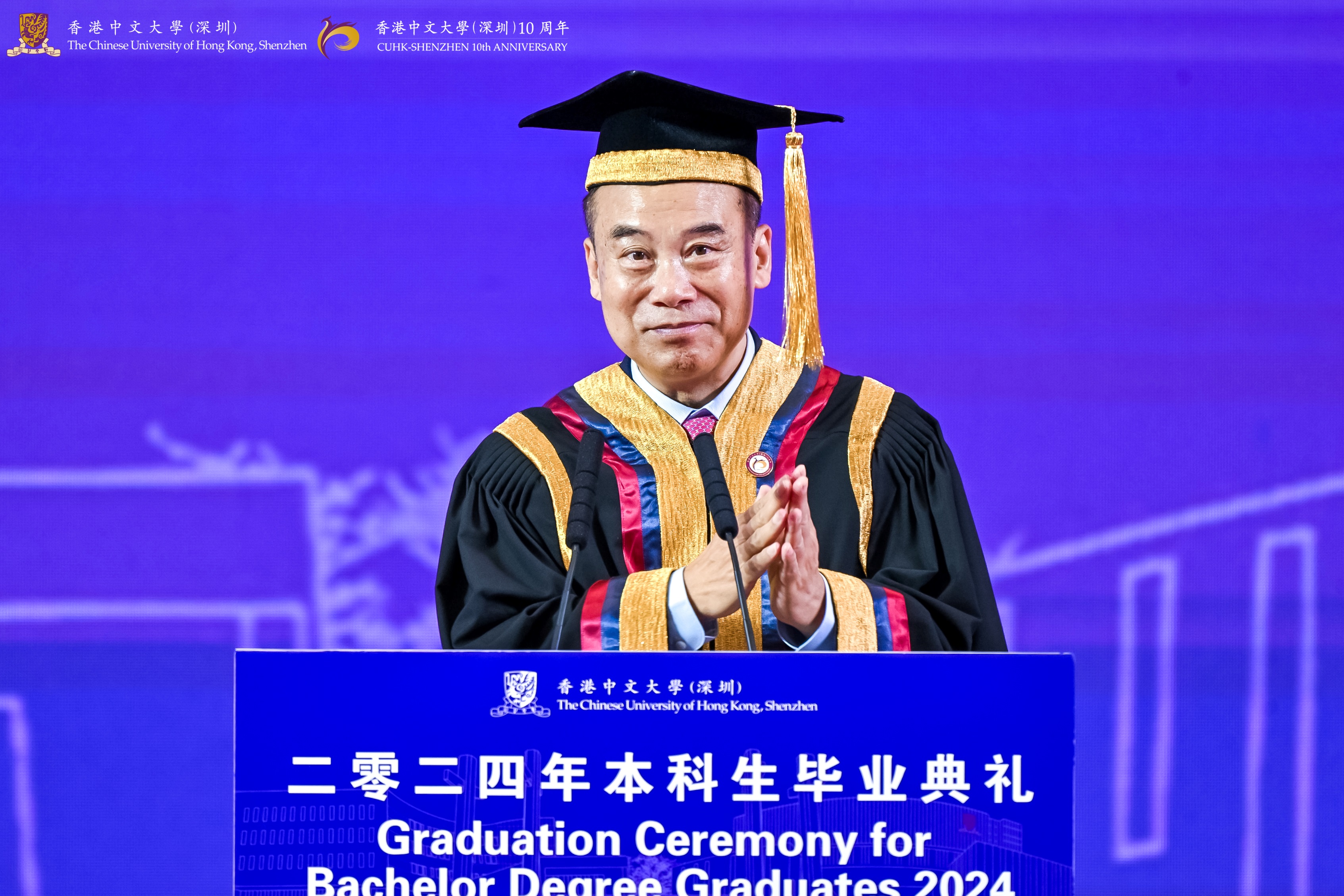 5月19日,香港中文大學(深圳)2024年本科生畢業典禮在大學禮文堂舉行。大學理事會成員代表、校長徐揚生教授及大學主管人員、教師代表在現場共同見證了1671名2024屆本科畢業生圓滿完成學業,踏上嶄新征程,奔赴廣闊天地。中國工程院院士、著名微生物學家、傳染病學專家袁國勇教授發表主題演講。來自全國各地的3000多名2024屆本科畢業生家長及親友,遠程而來的國際生親友以及社會各界嘉賓相聚神仙湖畔,共同觀禮祝賀。