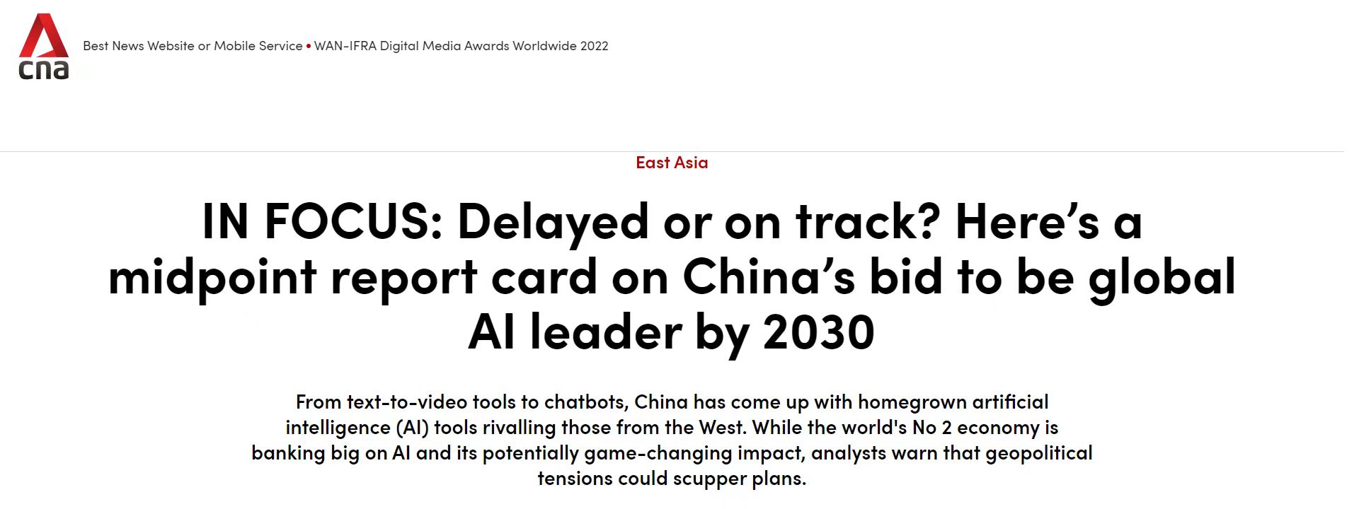 2024年8月10日,亞洲新聞臺(Channel News Asia)在其焦點訪談文章“IN FOCUS: Delayed or on track? Here’s a midpoint report card on China’s bid to be global AI leader by 2030”(聚焦:延遲還是按計劃推進?這是中國力爭在2030年成為全球AI領導者的中期報告)中,對中國在AI領域的現狀進行了深入報道。