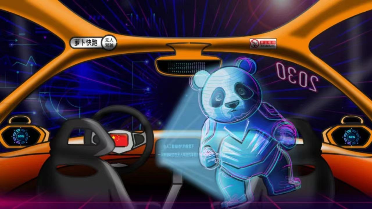 CNA以插畫的形式描繪了中國AI技術領域的雄心,插畫中的文字寫道:“在人工智能時代的背景下,一只熊貓站立在無人駕駛汽車的駕駛艙內。”