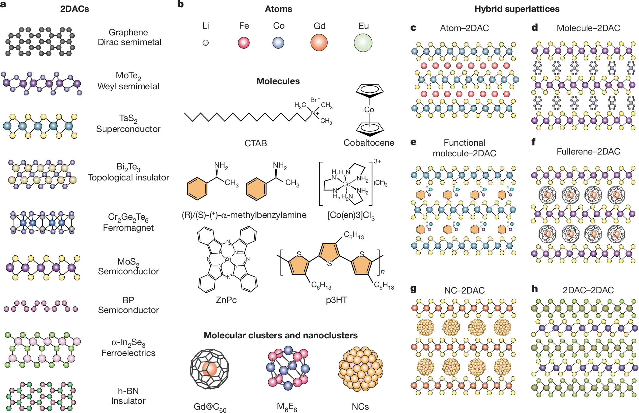 為應對這些挑戰,錢琦教授團隊提出:利用二維原子晶體可以將這兩種截然不同的材料系統結合起來,創造出一種動力學穩定、性質可控、模塊化的新型合成固體。二維原子晶體層間是范德華間隙,允許插入各種分子而不會破壞已有的共價鍵,從而產生豐富的層狀雜化超晶格 (LHSL)。層狀雜化超晶格具有以下幾個顯著優勢:(i)分子層兩側高度有序的二維晶體模板提供了強大的驅動力來引導分子有序排列;(ii)插層分子與二維晶體模板之間的范德華相互作用讓分子有更大的流動性,可尋找最低能量狀態并進行有序自組裝;(iii)二維原子晶體為分子提供了強大的物理保護和電子界面,從而能夠讓分子更穩固地集成到固態設備中。最終把具有不同化學成分和量子特性的體系編織成一體化的人工固態材料 (圖1)。