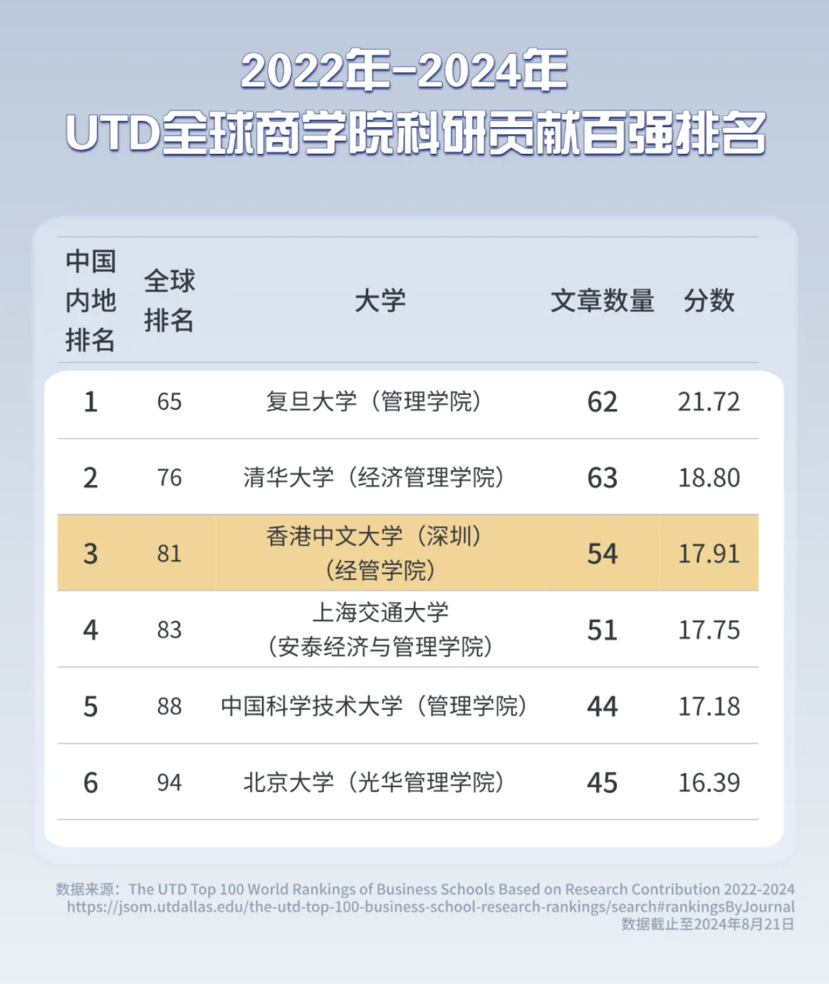 在最新發布的2022-2024年UTD全球商學院科研貢獻排名中,大學經管學院憑借其卓越的研究成果和學術貢獻成功躋身世界百強,高居中國內地高校商學院第三名。