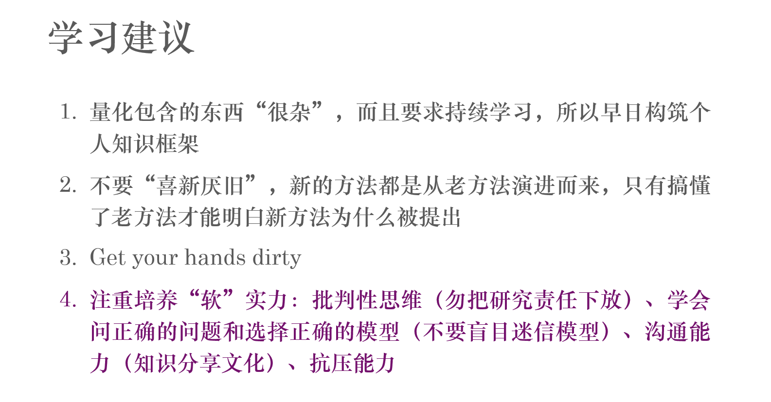 因此,石教授鼓勵學生在掌握數理和計算機知識的同時,加強對金融和經濟學理論的掌握,只有在理論框架下應用復雜的模型和算法,才能在 AI 時代的競賽中保持優勢。