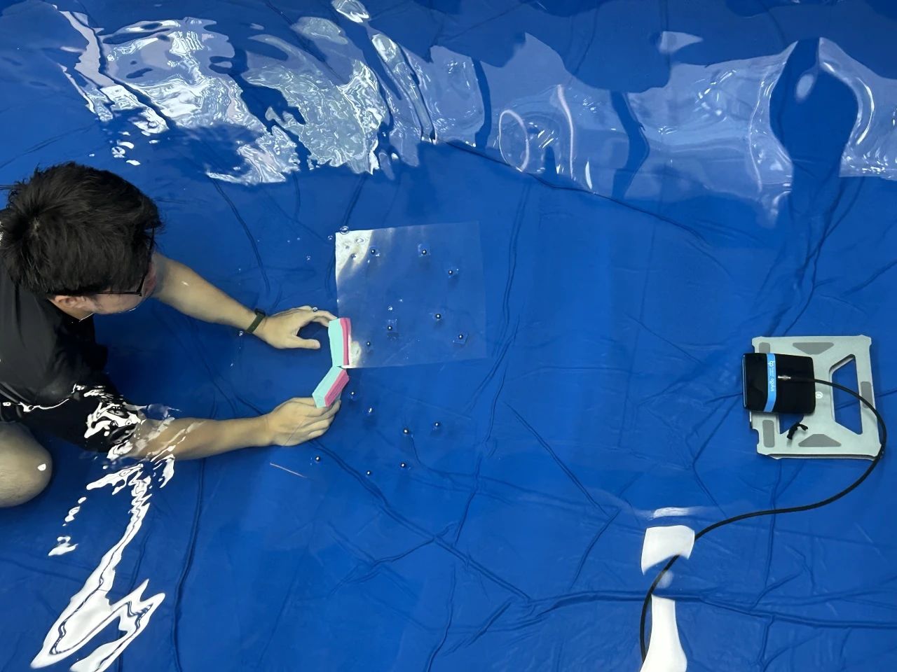 在實(shí)驗(yàn)室的方形試驗(yàn)池中,一臺(tái)智能水下機(jī)器人正在進(jìn)行水下真機(jī)實(shí)驗(yàn)。研究團(tuán)隊(duì)通過聲吶定位與多模態(tài)感知兩項(xiàng)核心實(shí)驗(yàn),推動(dòng)深海自主探測(cè)技術(shù)實(shí)現(xiàn)突破性進(jìn)展。池底鋪設(shè)著帶有精密反聲學(xué)結(jié)構(gòu)的標(biāo)定裝置。搭載前視成像聲吶的機(jī)器人對(duì)其進(jìn)行掃描,同時(shí)持續(xù)發(fā)射高頻聲波信號(hào)并采集反射特征。在算法驗(yàn)證環(huán)節(jié),機(jī)器人沿預(yù)設(shè)的“8”字形及“LIAS” (吳均峰教授領(lǐng)導(dǎo)的智能自主系統(tǒng)實(shí)驗(yàn)室“The Laboratory for Intelligent Autonomous Systems”的英文縮寫)字樣軌跡運(yùn)動(dòng),軌跡設(shè)計(jì)包含連續(xù)急轉(zhuǎn)、慣性滑行等典型運(yùn)動(dòng)模態(tài)。 “這類復(fù)合路徑能產(chǎn)生各向的位姿變化,能夠全面驗(yàn)證定位算法在急轉(zhuǎn)、急停等復(fù)雜運(yùn)動(dòng)狀態(tài)下的位姿解算精度。”項(xiàng)目負(fù)責(zé)學(xué)生解釋道。