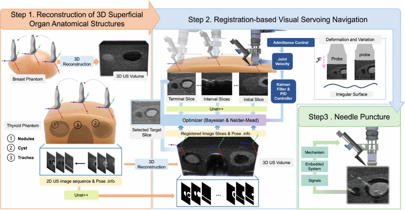 圖:自主超聲引導穿刺活檢工作流程:1)3D解剖結構預處理;2)基于配準的視覺伺服和導航;3)細針穿刺活檢
