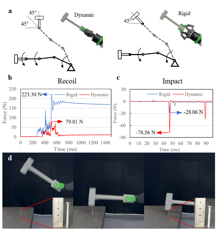 實驗表明,該方法相比傳統將錘子剛性固定的方式,在增強沖擊力(提升179.97%,從28.06 N提升至78.56 N)和減少反沖(下降64.26%,從223.30 N降至79.81 N)方面表現顯著。該方法還適配不同質量分布的錘子,展現出優越的操作靈活性和動態適應能力。研究成果為高動態觸覺交互任務提供了有效的新思路。