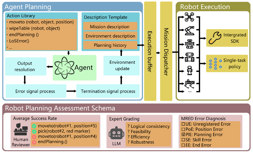 為支持訓練與評估,我們構建了 MultiPlan+ 數據集,涵蓋 100 個場景、超過18,000條帶注釋的規劃實例,其中包含部分反事實任務,用于緩解幻覺風險。除此之外,本文提出了機器人規劃評估框架(RPAS),結合自動化指標與大語言模型輔助的專家評估,以全面衡量模型性能。實驗結果顯示,EmbodiedAgent 在多個基準任務中均優于現有先進方法,RPAS 得分達到 71.85%,并在真實辦公服務任務中展現出多機器人的長時序協作控制與執行能力。