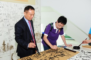 學(xué)校組織學(xué)生分組游覽校園,介紹學(xué)生以后經(jīng)常使用的學(xué)習(xí)、生活和活動區(qū)。期間,還有同學(xué)與校長在道遠(yuǎn)樓“華人學(xué)者書法展“展臺前一同完成書法作品。