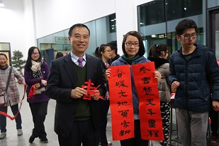 ? ? ? ?2月11日晚,暫別緊張的期中考試,我校學子換上新裝,迎來在大學里度過的第一個小年夜。當晚,由學生社團錦灰社和書法社聯合主辦的“剪窗花、寫春聯”慶祝活動在圖書館前舉行。校長徐揚生教授到場與100余位同學一起感受書法藝術和剪紙藝術的魅力,在歡聲笑語中體味中國傳統的年文化精髓。教授們和同學們同臺潑墨,楷體與隸書齊飛,筆墨在紅箋上縱橫。徐校長更是應同學們的要求,一一為大家贈送墨寶。同學們不但被徐校長多變無常的筆法所吸引,更為校長隨手化用同學名字作題的才華所打動。