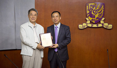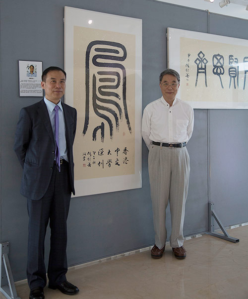 ? ? ? ?何院士在香港中文大學(深圳)華人學者書法展自己作品前與校長徐揚生教授合影
