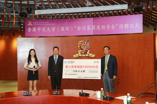 ? ? ?9月22日下午,金信集團與香港中文大學(深圳)教育基金會百萬人民幣獎助學金捐贈簽約儀式在香港中文大學(深圳)舉行。金信集團董事長張建偉先生、常務副總裁張曉珊女士、副總裁張鴻程先生、香港中文大學(深圳)校長徐揚生院士、副校長阮健驄先生、協理副校長李霞教授、大學規劃與協調處處長黃順真女士等嘉賓出席本次捐贈儀式。
