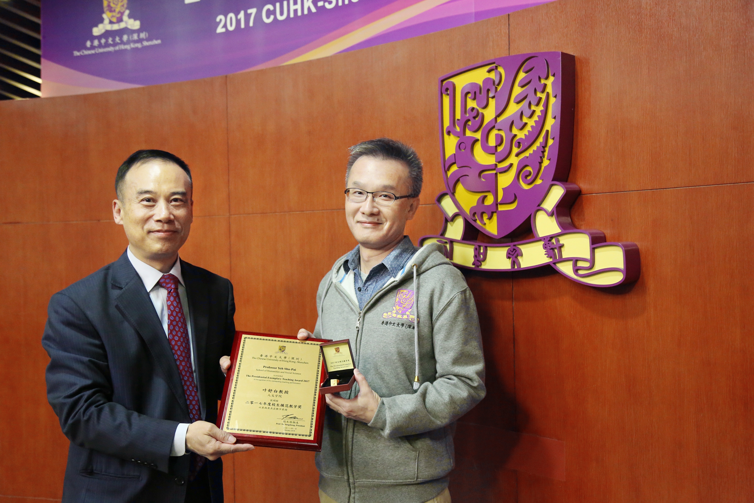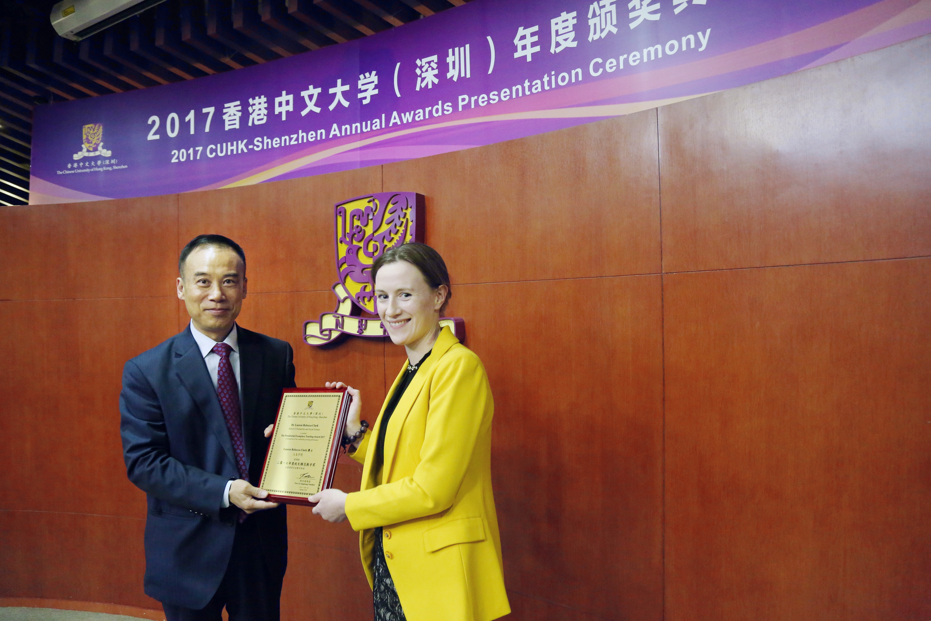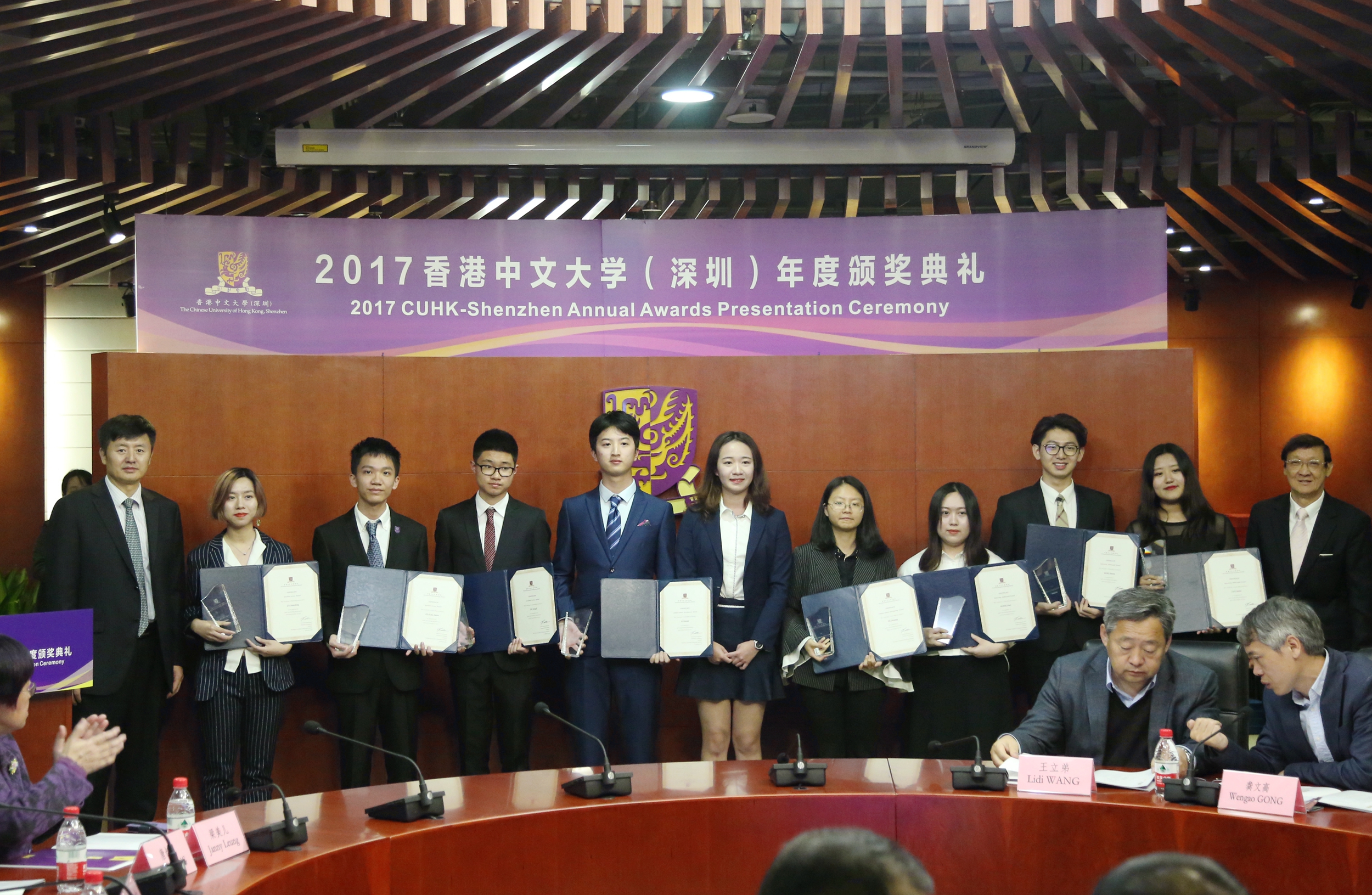 ? ? ? ? ?1月25日,香港中文大學(深圳)舉行了2017年度頒獎典禮,港中大(深圳)校長徐揚生教授,副校長(學術)羅智泉教授、副校長(外事及學生事務)朱世平教授、副校長(行政)阮健驄先生、協理副校長兼學生事務處處長李霞教授、協理副校長兼科研處處長李學金教授、協理副校長(教育及港中大事務)蔡小強教授、協理副校長(全球事務)施雅徳教授、研究生院長唐叔賢教授以及書院、學院、行政部門負責人出席了本次頒獎典禮。本次頒獎典禮不僅表彰了在學術、領導才能和建設校園文化等方面表現卓越的優秀學生代表,而且首次設立“校長模范教學獎",以表揚優秀教師中的代表。