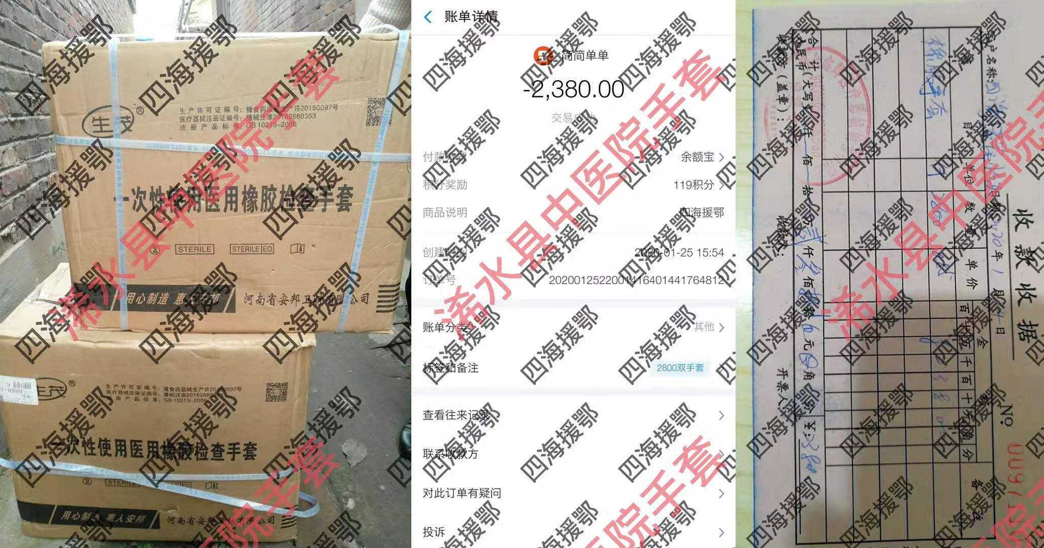 ? ? ? ? 在每一個伙伴的努力下,奇跡發生了,僅用了24小時,我們便籌集了第一批900個護目鏡給到襄陽中醫院等三個醫院,并為三家縣醫院寄去兩萬多雙醫用檢查手套。