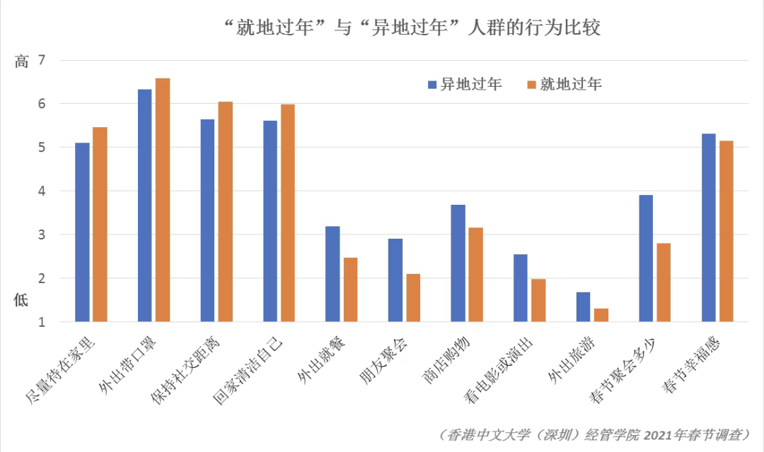 ? ? ? 新冠疫情仍然是人們面臨的主要威脅,感受到有較大、很大和巨大威脅的人群占比仍高達74.90%,這一廣泛和持續的威脅給人們帶來了不同程度的心理壓力,有18.7%的人群感受到壓力較大、很大和巨大。調查分析發現,雖然就地過年和異地過年的兩個群體在感知威脅和壓力不存在顯著差別,但是他們之間在疫情應對行為和生活方式上存在顯著差別。選擇就地過年的群體他們有更多和更強的防護行為,包括外出戴口罩、保持社交距離、回家時清潔自己;他們更加傾向于待在家里,因此在外出就餐、朋友聚會、商店購物、看電影或演出、外出旅行等戶外活動方面要顯著低于異地過年的群體。同時,這兩個群體在春節聚會方面也存在顯著差別,異地過年的群體春節期間跟親朋好友聚會的頻率與去年相近,而就地過年的群體春節聚會的頻率要顯著低于去年,前者有26.25%的人群的春節聚會比去年減少較多和很多,而后者這一占比為53.62%,這可能是由于春節期間多數本地朋友離開,減少了選擇就地過年人群的聚會機會,而沒有返回老家自然失去了與親人和朋友春節團聚的快樂。
