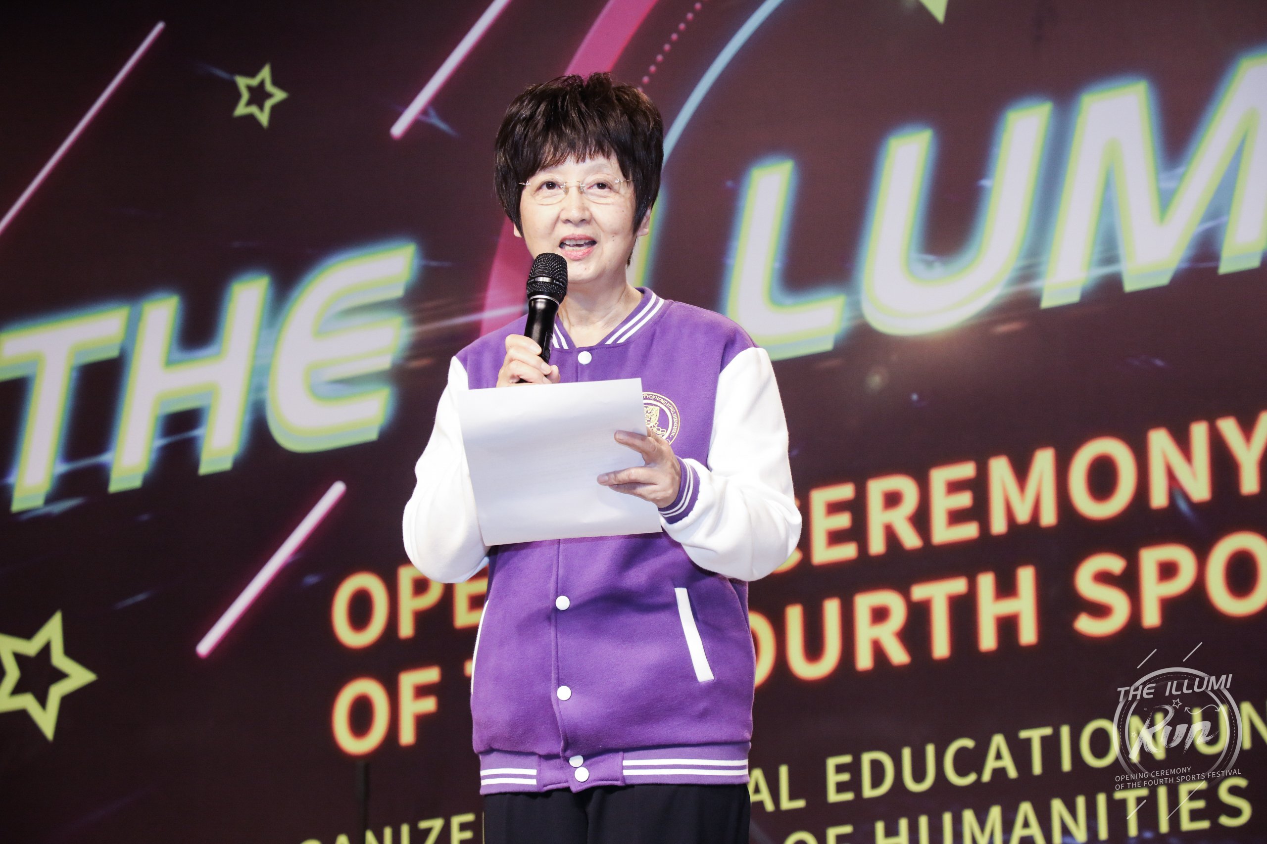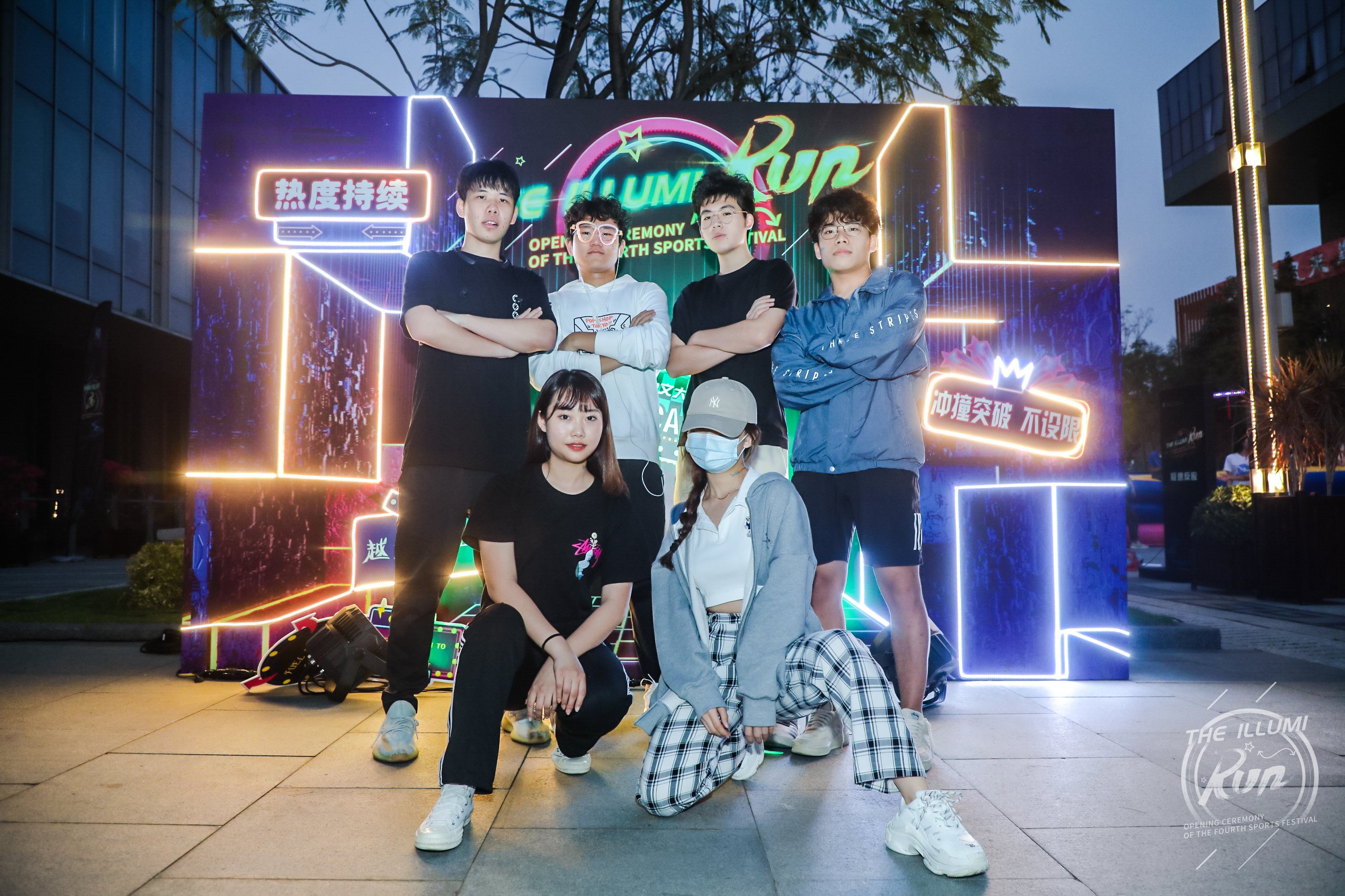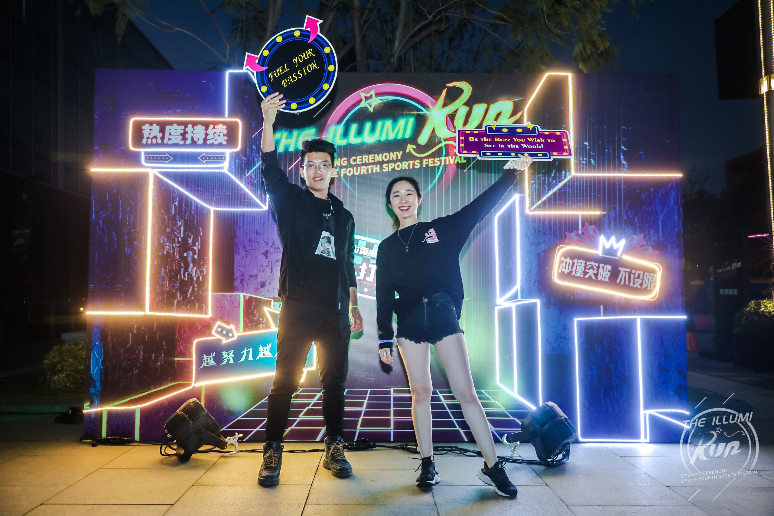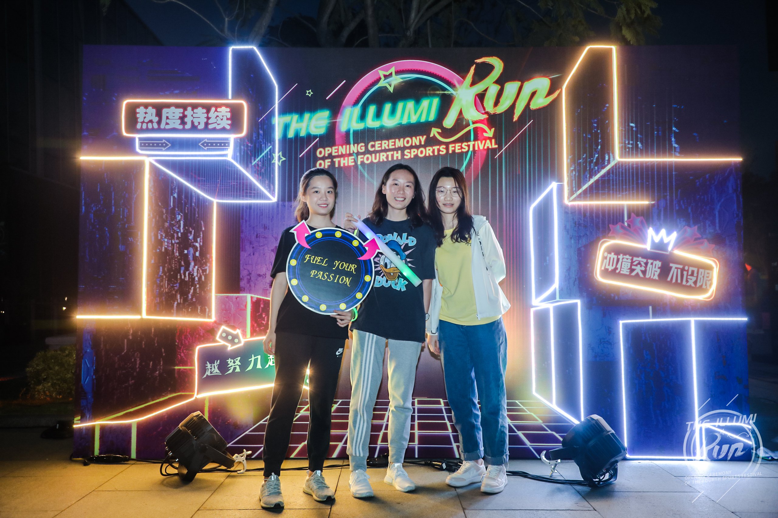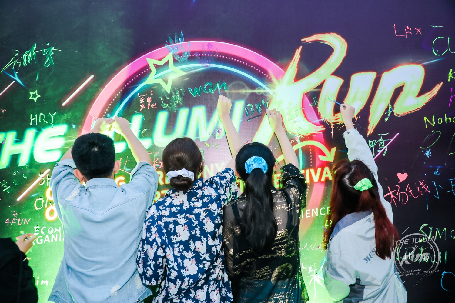 簡短的熱身環節后,現場師生移步到教學樓A、B之間的熒光拱門處,隨著顧陽教授手中發令汽笛的一聲長鳴,穿戴好熒光裝備的人們歡樂開跑,標志著第四屆體育節正式開幕。