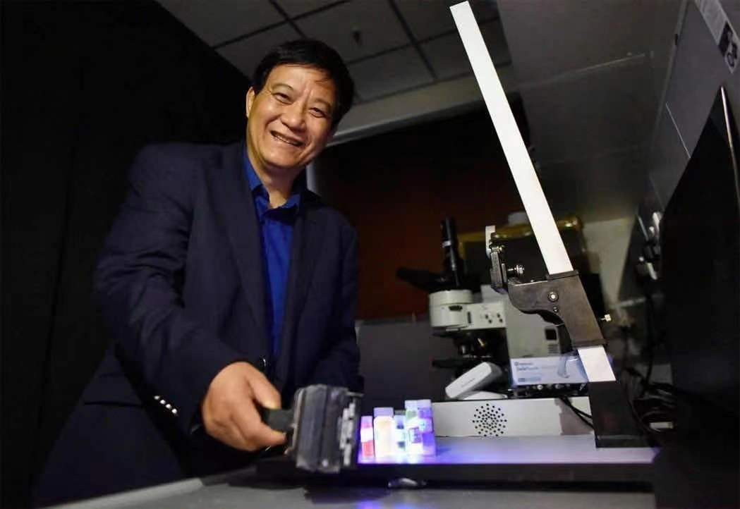 在香港科技大學工作期間,唐本忠在實驗室里展示其科研團隊開發出的發射各種顏色的AIE材料。(資料照片)