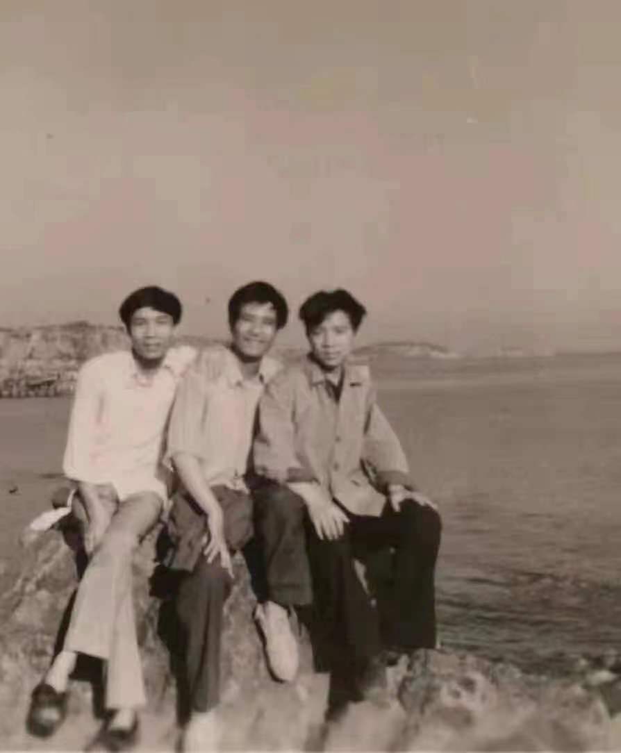 1982年,唐本忠(中)在大連外國語學院培訓班學習日語時與同學在海邊合影。(資料照片)