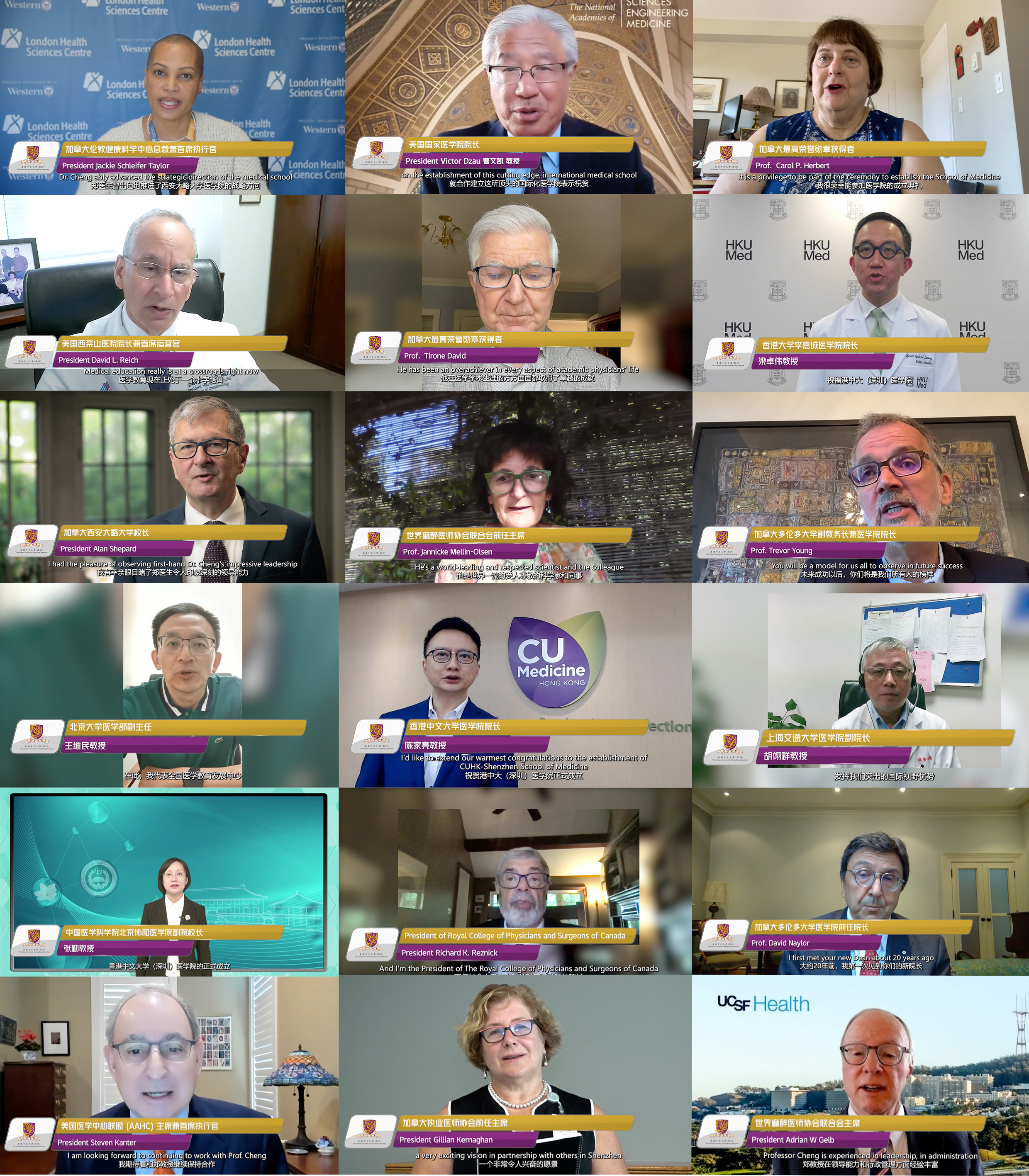 ? ? ? ? 此外,來自美國國家醫學院院長Victor Dzau,加拿大皇家內科和外科醫師學會主席Richard. K. Reznick,加拿大多倫多大學前任校長、加拿大多倫多大學醫學院前任院長David Naylor,加拿大西安大略大學校長Alan Shepard,美國西奈山醫院院長兼首席運營官David L. Reich,加拿大最高榮譽勛章獲得者Carol P. Herbert,加拿大執業醫師協會前任主席Gillian. Kernaghan,加拿大多倫多大學副教務長兼醫學院院長Trevor Young,加拿大最高榮譽勛章獲得者Tirone David,世界麻醉醫師協會聯合會主席Adrian. W. Gelb,世界麻醉醫師協會聯合會前任主席Jannicke Mellin-Olsen,美國國際醫學中心聯盟(AAHCI)主席兼首席執行官Steven Kanter,香港中文大學醫學院院長陳家亮,香港大學李嘉誠醫學院院長梁卓偉,北京大學醫學部副主任王維民,中國醫學科學院北京協和醫學院副院校長張勤,上海交通大學醫學院副院長胡翊群,南方科技大學醫學院院長邢明照通過視頻為本次儀式與鄭仲煊院長就任送上賀詞和祝福。
