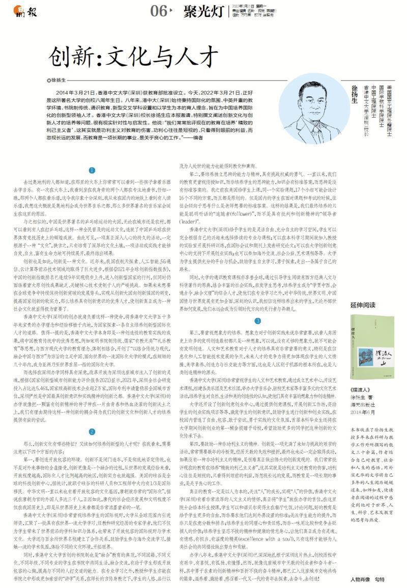 ? ? ? ? 香港中文大學(深圳)校長徐揚生晶報邀請,特別撰文闡述創新文化與創新人才的培養等問題,很有現實針對性與啟發性。他說:“我們常常批評現在的教育在培養‘精致的利己主義者’,這其實就是功利主義對教育的傷害,功利心往往是短視的,只看得到眼前的利益,而忽視長遠的發展,而教育是一項長期的事業,是關乎良心的工作。”