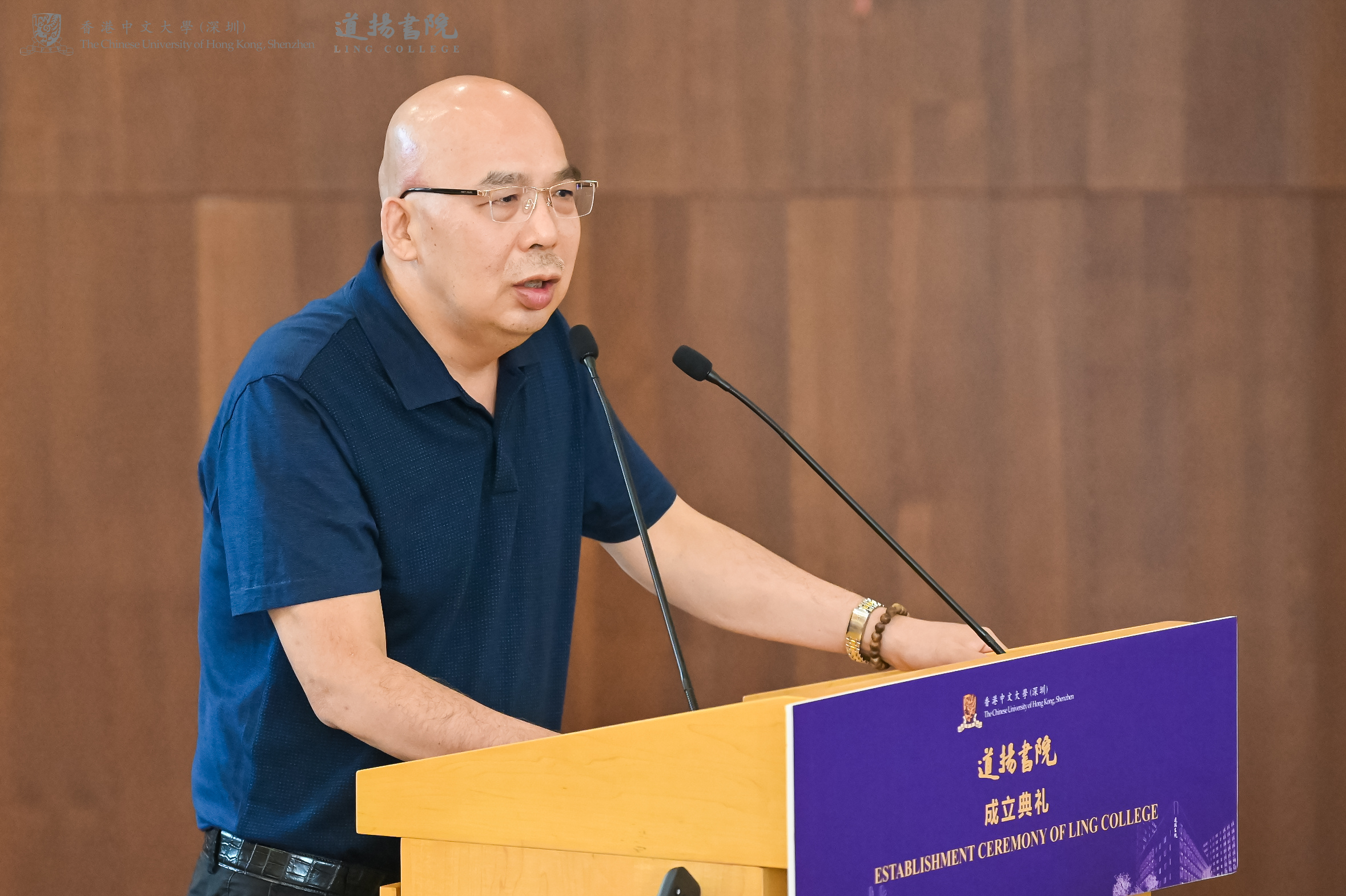 ? ? ? ? 道揚(yáng)書院捐贈人、深圳市百合控股集團(tuán)董事長凌國強(qiáng)先生在致辭中表示,凌氏家族非常重視教育,作為凌氏家族的后人參與到書院的捐贈中來,是特殊而珍貴的緣分。他相信在徐揚(yáng)生校長的領(lǐng)導(dǎo)下,在杜子德院長的帶領(lǐng)下,在香港中文大學(xué)(深圳)各位老師、同學(xué)們以及社會各界的大力支持下,道揚(yáng)書院一定能辦好。他也希望同學(xué)們在道揚(yáng)書院學(xué)業(yè)進(jìn)步,結(jié)下友誼。