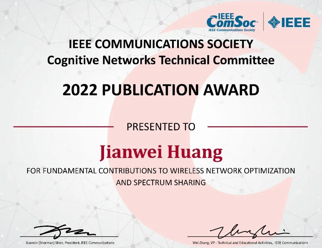 黃建偉教授榮獲2022年IEEE認知網絡技術委員會論文貢獻獎