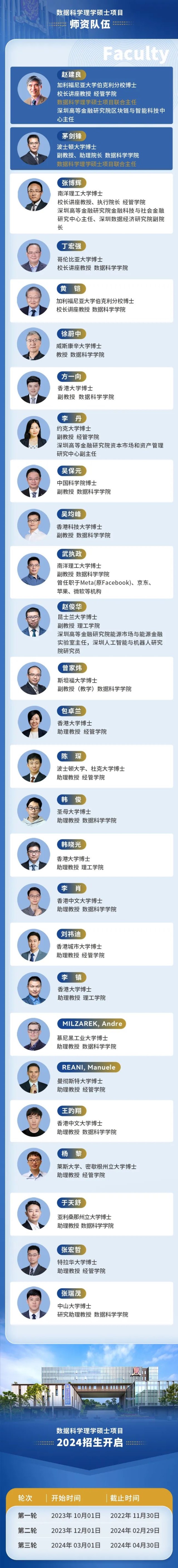數(shù)據(jù)科學(xué)理學(xué)碩士項(xiàng)目由香港中文大學(xué)(深圳)數(shù)據(jù)科學(xué)學(xué)院與經(jīng)管學(xué)院共同開設(shè),并與深圳市大數(shù)據(jù)研究院和深圳高等金融研究院合作,學(xué)院及研究院的優(yōu)秀師資將共同擔(dān)任項(xiàng)目授課教師。項(xiàng)目開設(shè)有商業(yè)分析和大數(shù)據(jù)分析兩個細(xì)分方向。