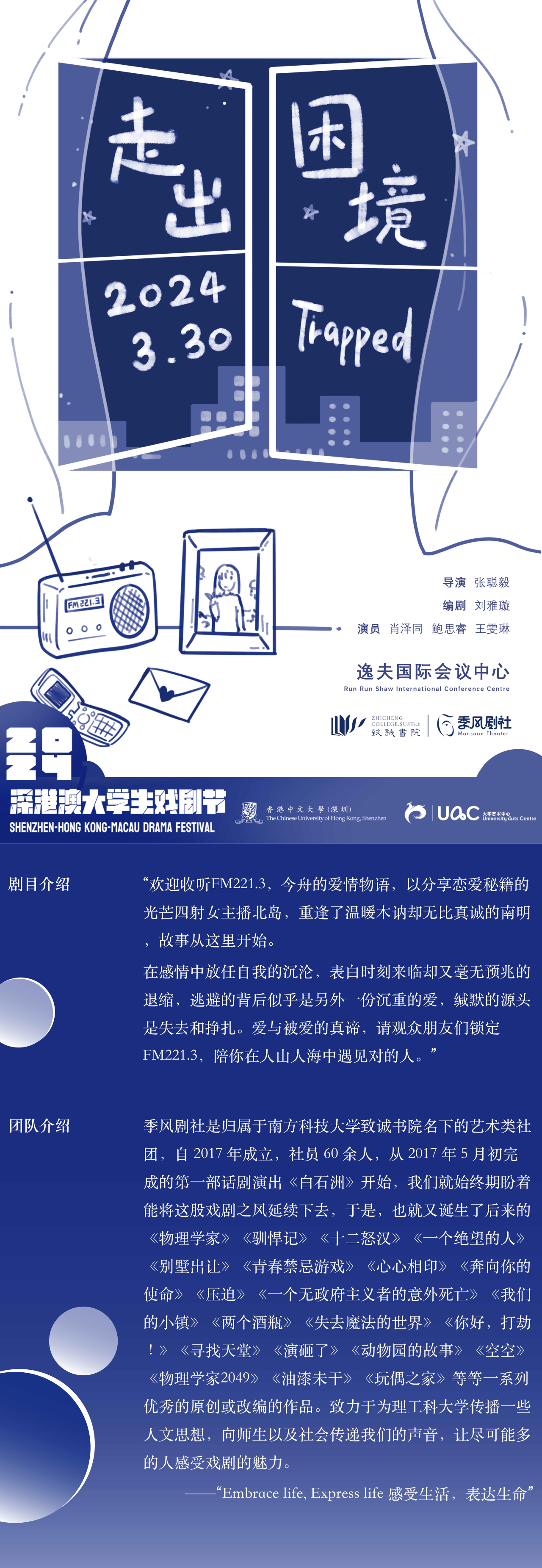 3月27日是“世界戲劇日”(World Theatre Day),由國際戲劇協會(International Theatre Institute, ITI)創立,旨在喚起全世界對戲劇藝術的關注和重視。就在今天,2024深港澳大學生戲劇節展演開放報名!