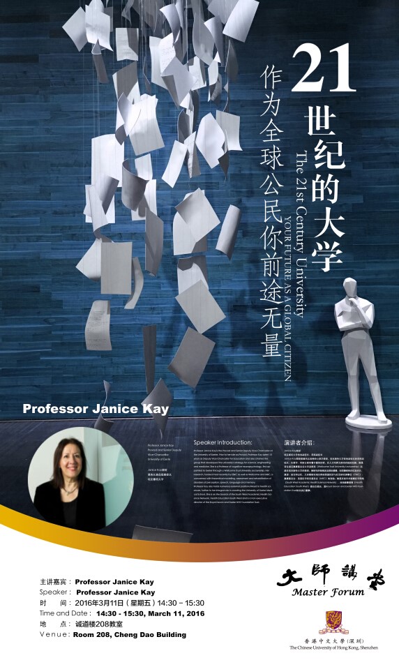Janice Kay教授將探討大學(xué)在21世紀(jì)發(fā)揮的作用,以及大學(xué)如何將學(xué)生培養(yǎng)成為未來(lái)的領(lǐng)袖,在競(jìng)爭(zhēng)激烈的全球市場(chǎng)中脫穎而出。英國(guó)及全球大學(xué)均面臨重大變革,因?yàn)檎饾u將資金轉(zhuǎn)向更為優(yōu)先的領(lǐng)域。同時(shí),高等教育的市場(chǎng)化的長(zhǎng)期影響,也帶來(lái)新的壓力,創(chuàng)新、創(chuàng)業(yè)對(duì)于學(xué)生將來(lái)的成功和學(xué)生對(duì)學(xué)校的滿(mǎn)意度比以往任何時(shí)候都更加重要。Janice Kay教授將討論大學(xué)在社會(huì)中日益重要的影響,介紹高等教育的主要趨勢(shì)以及對(duì)學(xué)生的影響。Janice教授還將介紹全球經(jīng)濟(jì)中大學(xué)發(fā)揮的作用,全球公司及組織對(duì)大學(xué)教育提供的高水平人才的龐大需求,以及同學(xué)們作為全球公民取得職業(yè)成功需要掌握的技能。