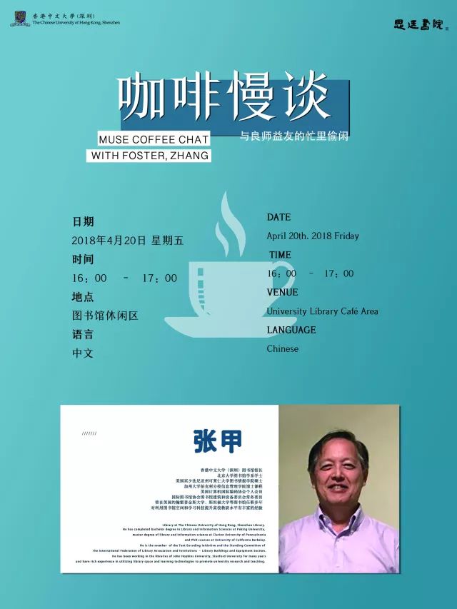 ? ?? 張甲現任香港中文大學(深圳)圖書館館長。他曾取得北京大學圖書館學系學士,美國賓夕法尼亞州可萊仁大學圖書情報學院碩士,參加了加州大學伯克利分校信息管理學院博士課程。他擔任美國計算機國際編碼協會個人會員和國際圖書館協會圖書館建筑和設備委員會常務委員。張甲館長曾在美國約翰霍普金斯大學,斯坦福大學等圖書館任職多年,對利用圖 書館空間和學習科技提高高校教研水平有豐富經驗。