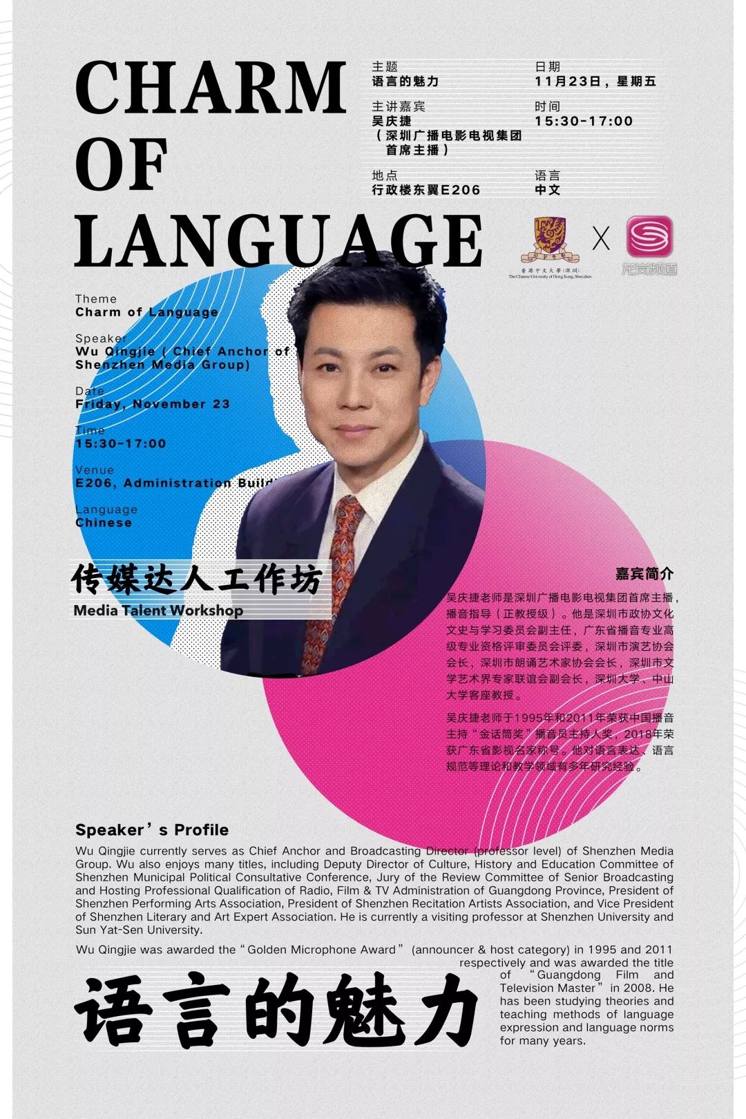 傳媒達人工作坊”第八講活動將于11月23日在我校行政樓東翼E206舉辦。深圳廣播電影電視集團首席主播吳慶捷老師將帶大家感受語言的魅力。