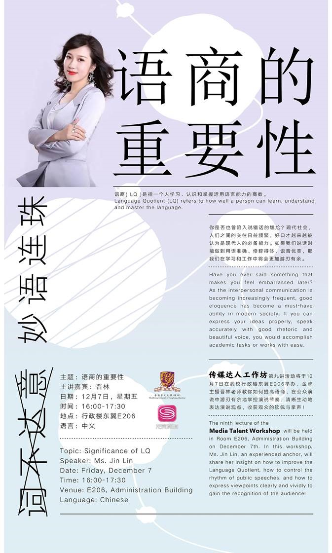 ? ? ? ? “傳媒達人工作坊”第九講活動將于12月7日在我校行政樓東翼E206舉辦,金牌主播晉林老師教你如何提高語商,在公眾演說中游刃有余地掌控演說節奏,清晰生動地表達演說觀點,收獲觀眾的欽佩與掌聲!