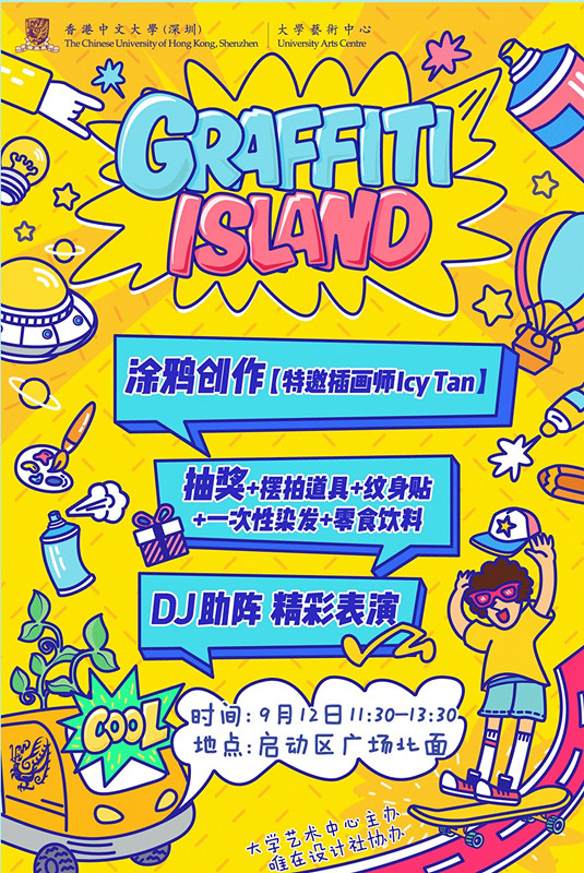 新的學年,大學藝術(shù)中心將聯(lián)合第16期駐校藝術(shù)家Icy Tan,優(yōu)秀藝術(shù)涂鴉團隊以及Wesig設計社為涂鴉墻進行一次換裝活動。